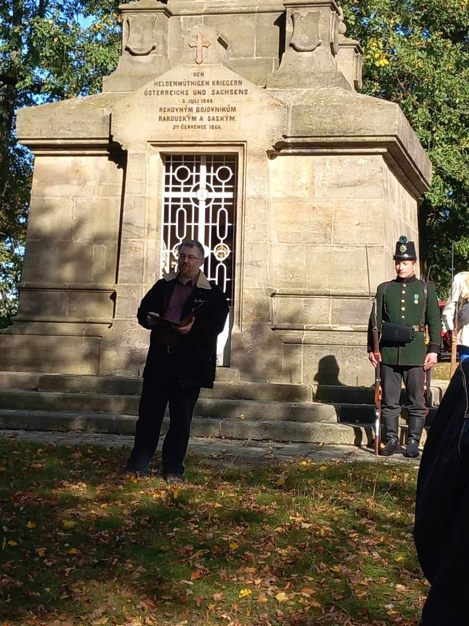 Po krátkém úvodu moderátora nejprve ředitel projektu vzpomínkových akcí Königgrätz 1866 Radek Balcárek pohovořil o letošní sezóně na bojišti, kterou již tradičně dušičková akce uzavírá. Poté vedoucí Muzea války 1866 na Chlumu J. Hrubecký seznámil přítomné se zajímavými detaily opravy historického oltáře mauzolea, které bylo postaveno libereckým továrníkem a majitelem smiřického velkostatku Johanem Liebiegem na památku rakouských a saských vojáků padlých v bitvě u Hradce Králové a bylo slavnostně vysvěceno 3. července 1867. Na dlouhá desetiletí se pak stalo centrem vzpomínek na padlé celého bojiště a stejně tomu bylo i v roce 1951 při poslední veřejné akci královéhradeckého spolku, než byl zrušen komunistickým režimem a také v roce 1990 po obnovení Komitétu 1866. Předseda Komitétu 1866 M. Suchý vystoupil s projevem, ve kterém zdůraznil nutnost péče o válečné hroby a poučení se z minulosti, kdy v mnoha obdobích docházelo k pokusům o pokřivení historického pohledu a vymazání odkazu předků z povědomí obyvatelstva. Následovala bohoslužba u mauzolea, při které farář M. Benko a P. Megela vysvětili opravený oltář. Po položení věnce M. Suchým a Š. Demlovou třeskly čestné salvy, které celou pietní vzpomínku u mauzolea zakončily.