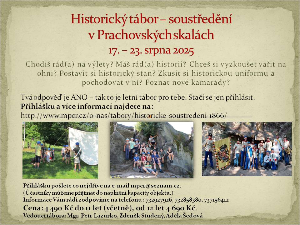 Budeme si ale povídat i o jiných tématech české historie. Soustředění je určeno pro všechny se zájmem o českou historii a zejména o rok 1866. Můžete se těšit na zajímavé povídání, výlety a hlavně na výcvik vojáka v roce 1866. Budeme stavět historické stany nebo cvičit se zbraněmi. Soustředění vyvrcholí polním tažením Českým rájem.