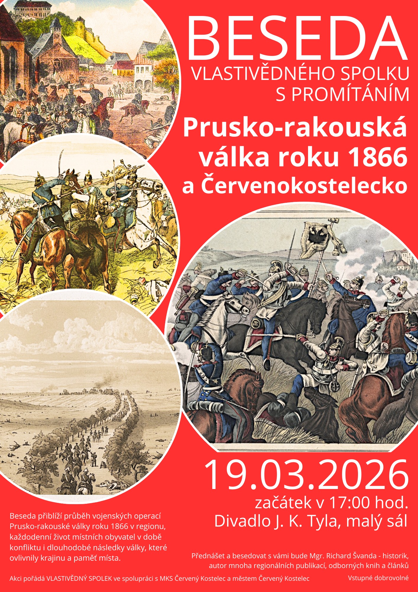 Beseda přiblíží průběh vojenských operací Prusko-rakouské války roku 1866 v regionu, každodenní život místních obyvatel v době konfliktu i dlouhodobé následky války, které ovlivnily krajinu a paměť místa.