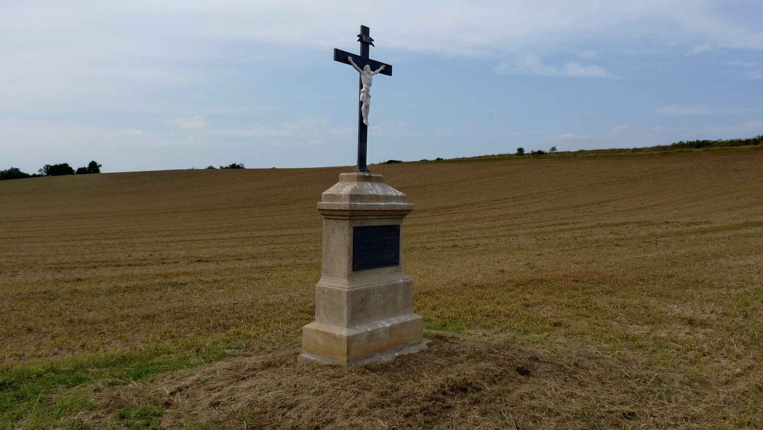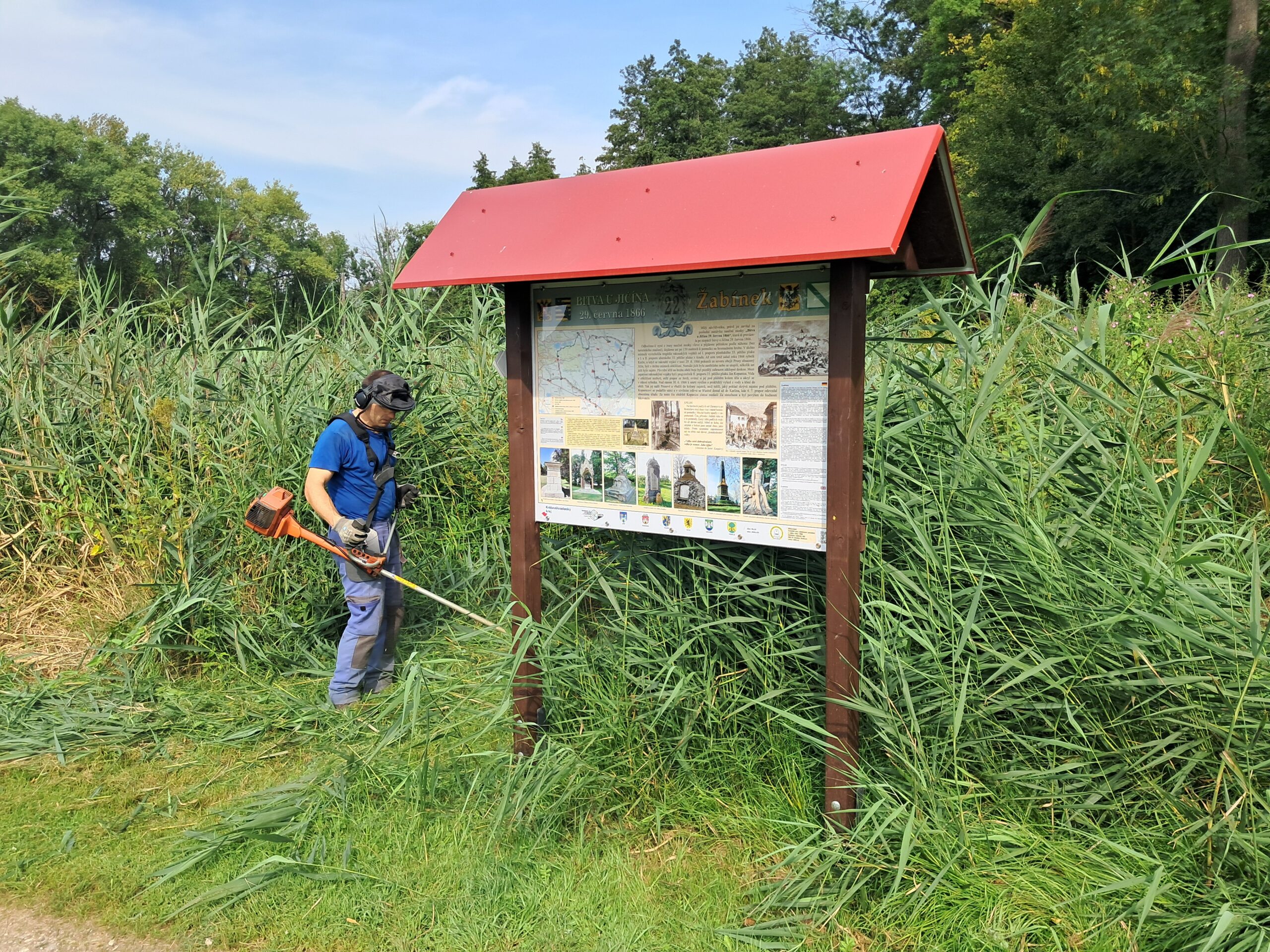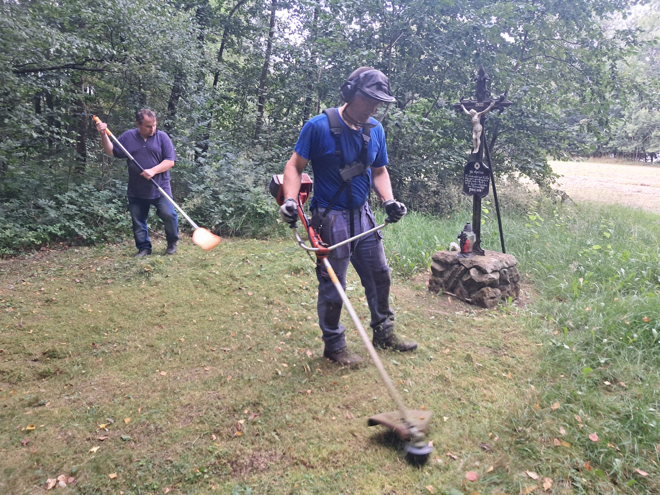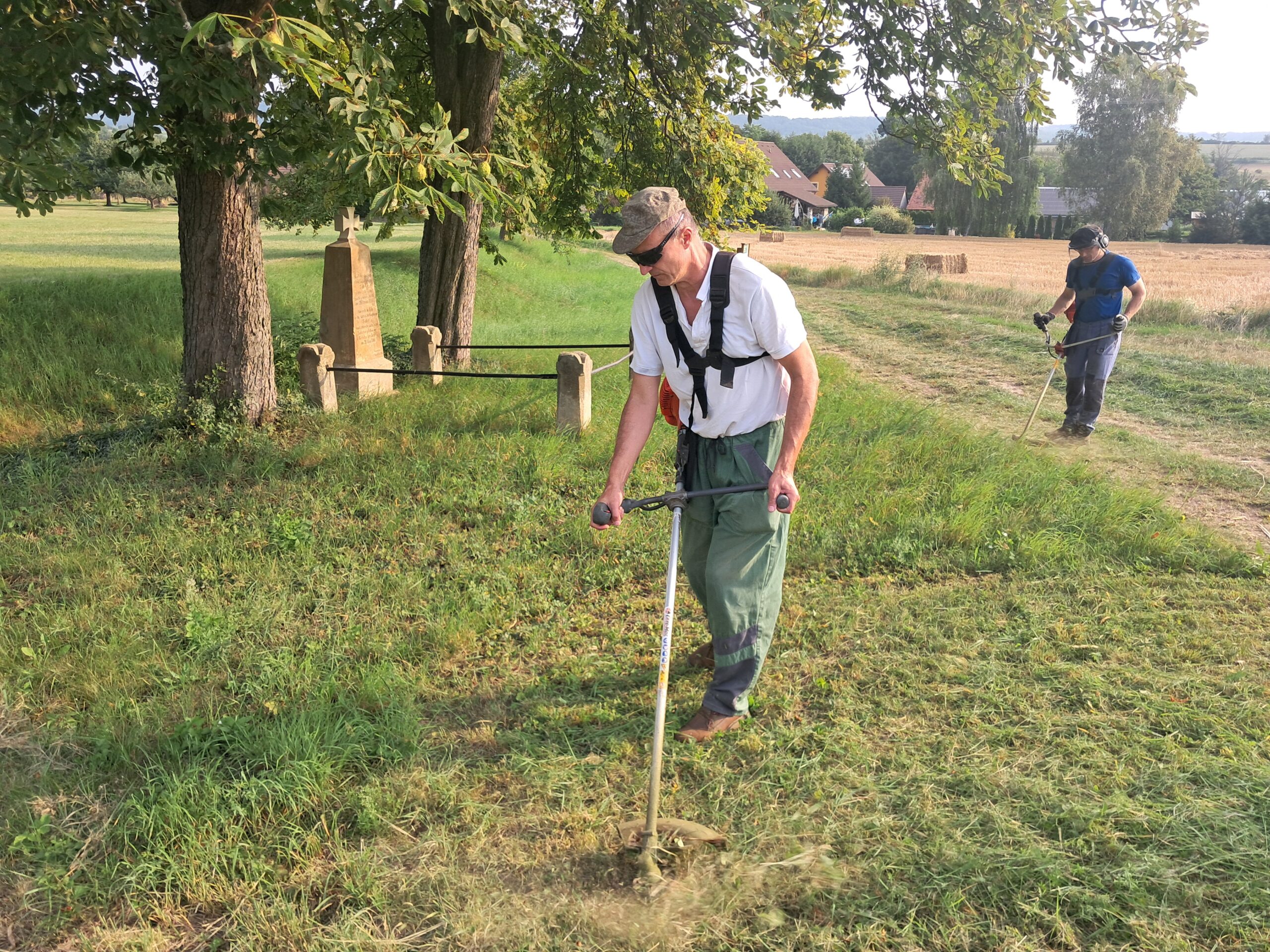 Druhá skupina ve složení Jiří Třešňák, Martin Drapák a Karel Peregrin se vydala k Jičínu a cestou nenechala jeden pomník ladem. Drobnou odbočkou z vytýčeného směru bylo posekání okolí pomníku ev. č. 25 u rybníka Vražda a také pomník ev. č. 53 nad osadou Rybníček. Pomník ev. č. 131 v Podůlší již byl ale přímo na cestě k Jičínu. Dalšími opečovanými pomníky byly ev. č. 51, 45 v Jičíně na Letné. Zde se odpojil Karel Peregrin a zbylí brigádníci pokračovali v práci u pomníku ev. č. 44 v Holíně, stojanu NS č. 4 Holín a NS č. 5 Nad Ohavčí. Dále zkontrolovali stav kříže ev. č. 132 na plotě rodinného domu v Holíně a vydali se zpět do Jičína na Letnou k centrálnímu pomníku ev. č. 46. Pomník ometli a poklidili okolí. Po průjezdu Jičínem do Sedliček přišel opět ke slovu křovinořez a bylo tak posekáno u pomníků ev. č. 12 a 11 a také ev. č. 142. Tradičně nejhustší tráva čekala u pomníku ev. č. 52 na Žabínku. Její hustý porost však byl pro křovinořez jen předkrmem před rákosem, který vzpurně čekal u stojanu NS č. 22 Žabínek. I s tím si však brigádníci poradili a poté se kolem 17 hodiny rozloučili. Jiří Třešňák se cestou domů ještě zastavil u loni restaurovaného pomníku ev. č. 15 a využil posekaného pole ke snadnějšímu přístupu k tomuto pomníku. Posekání a úprava jeho okolí byla důstojným zakončením této povedené brigády, za kterou patří všem zúčastněným za vykonanou práci velký dík.