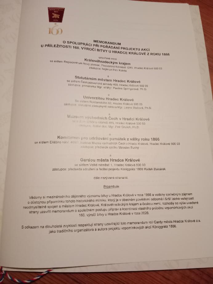 Dne 21. 1. 2026 v 11 hodin se konalo v budově MVČ v Hradci Králové slavnostní setkání aktérů a podpis Memoranda 160. výročí. Celá ceremonie měla velmi solidní úroveň a tím děkuji Ivanovi T. za zprostředkování a zajištění potřebného. Přítomno bylo 6 mužů v uniformách, tedy 3 rakušané + prapor a 3 prusové + prapor.