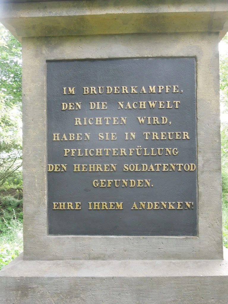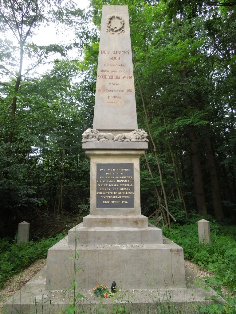 | Text na památce: | Čelní strana: \ DŮSTOJNICKÝ SBOR c. k. řadového pluku pěšího č. 40 SOUDRUHŮM SVÝM v bitvě dne 3. července 1866 padlým. \ DAS OFFICIERSCORPS DES K. K. 40. LIN = INFANT = REGIMENTS F. Z. M. BARON ROSSBACH WEIHT DIESES DENKMAL SEINEN AUF DIESEM SCHLACHTFELDE GEFALLENEN WAFFENGEFÄHRTEN. ERRICHTET 1867. \ Kom. 1890 Č. 3. \ Levá strana: \ HPTMN. ARTHUR EBERAN VON EBERHORST RUDOLF UNKELHÄUSER VON ABENST LIEUTN. ANTON FELLNER EMIL PHILIPP GUSTAV TREITLER VOR DEM FEINDE GEFALLEN AM 3. JULI 1866. \ Zadní strana: \ IM BRUDERKAMPFE, DEN DIE NACHWELT RICHTEN WIRD, HABEN SIE IN TREUER PFLICHTERFÜLLUNG DEN HEHREN SOLDATENTOD GEFUNDEN. EHRE IHREM ANDENKEN. \ Pravá strana: \ DEN, IN DER SCHLACHT AM 3. JULI 1866. GEFALLENEN TAPFERN VON DER MANNSCHAFT DES K. K. 40. LINIEN – INFANT – REGIMENTS.\ |