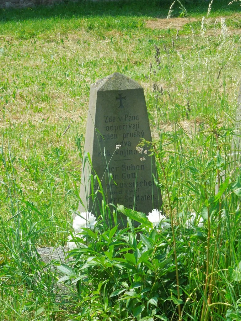 Čelní strana: \ Zde v Pánu odpočívají jeden pruský a dva rak. vojínové. \ Hier Ruhen in Gott ein preussischen und zwei osterr. Soldaten. 18 3/7 66. \ Pravá strana soklu: \ Renov. Kom. 1890. Č. 10. \