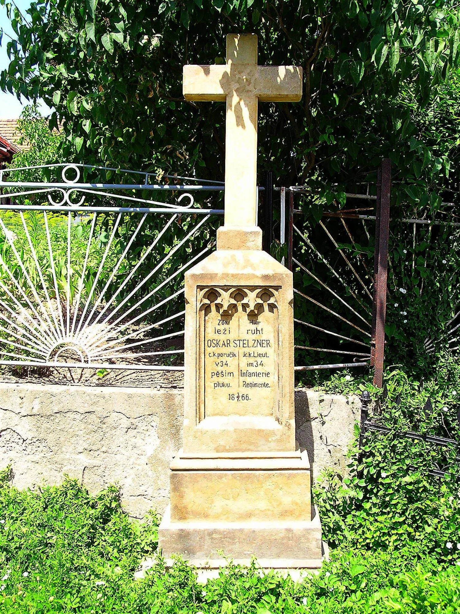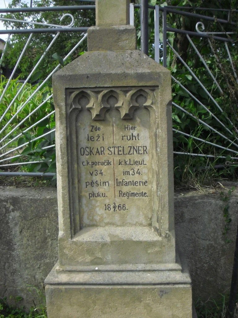 Čelní strana: \ Zde ↔ Hier leží ↔ ruht OSKAR STELZNER c. k. poručík ↔ k. k. Lieut. v 34. ↔ im 34. pěším ↔ Infanterie pluku. ↔ Regimente. \ 18 3./7. 66. \ Levá strana: \ Renov. 1906 Čís. 29. \
