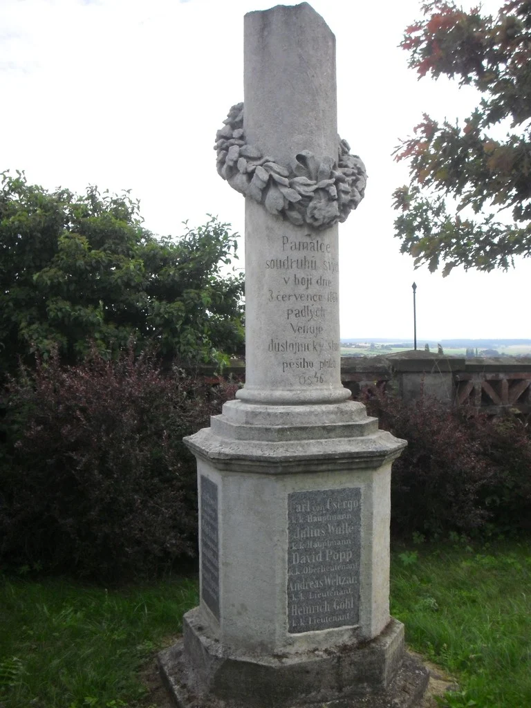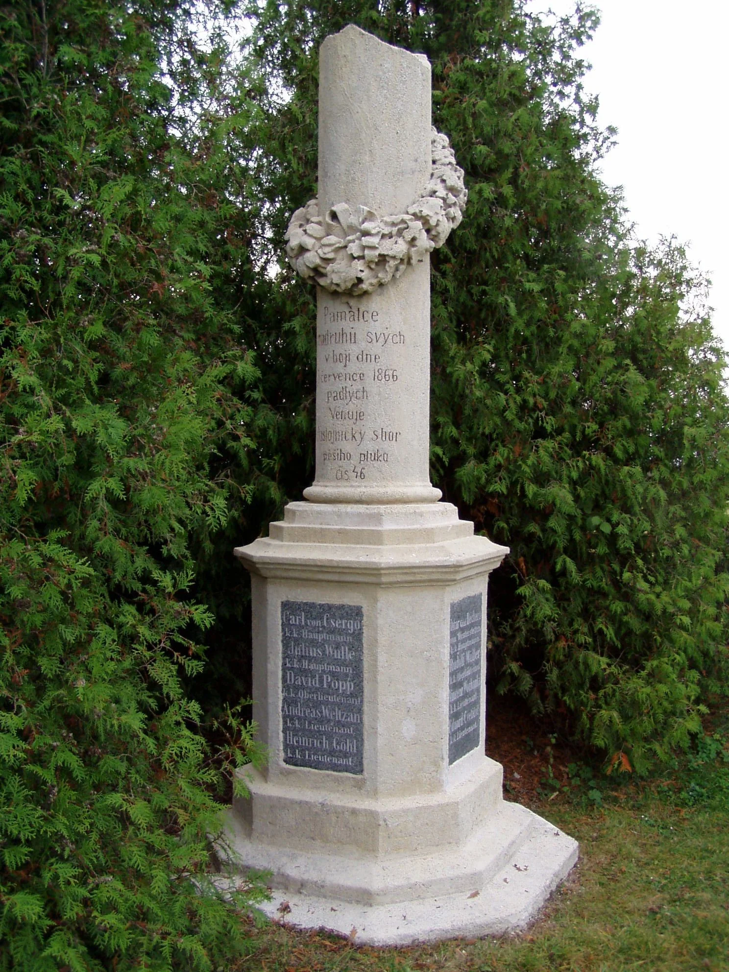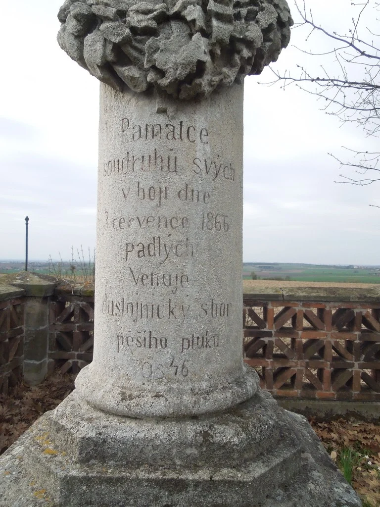Čelní strana sloupu: \ Památce soudruhů svých v boji dne 3. července 1866 padlých Věnuje důstojnický sbor pěšího pluku čís. 46 \ Nápisní deska na čelní straně: \ Carl von Csergö k.k. Hauptmann. Julius Wulle k.k. Hauptmann. David Popp k.k. Oberlieutenant. Andreas Weltzan k.k. Lieutenant. Heinrich Göhl k.k. Lieutenant. \ Nápisní deska na levé straně: \ Carl v.Slawecki k.k. Oberst u. Regiments Comandant. Peter Friedl k.k. Hauptmann. Leopold Fuchs k.k. Oberlieutenant. Demeter Zepeniag k.k. Lieutenant. \ Nápisní deska na zadní straně: \ Vom k.k. Officiers Corps des 46. L. I. R. Herzog von Sachsen Meiningen seinen in der Schlacht bei Königgrätz am 3. Juli 1866 gefallenen KAMERADEN 13 Officieren u. 280 Mann gewidmet \ Hintnerleitner in Wien \ Pravý zadní zkosený roh: \ Č. 31. \ Nápisní deska na pravé straně: \ Oscar Graf Beckers von Westerstetten k.k. Hauptmann. Rudolf Müller k.k. Oberlieutenant. Vincenz Wochanka k.k. Lieutenant. Eduard Cvetičič k.k. Lieutenant. \