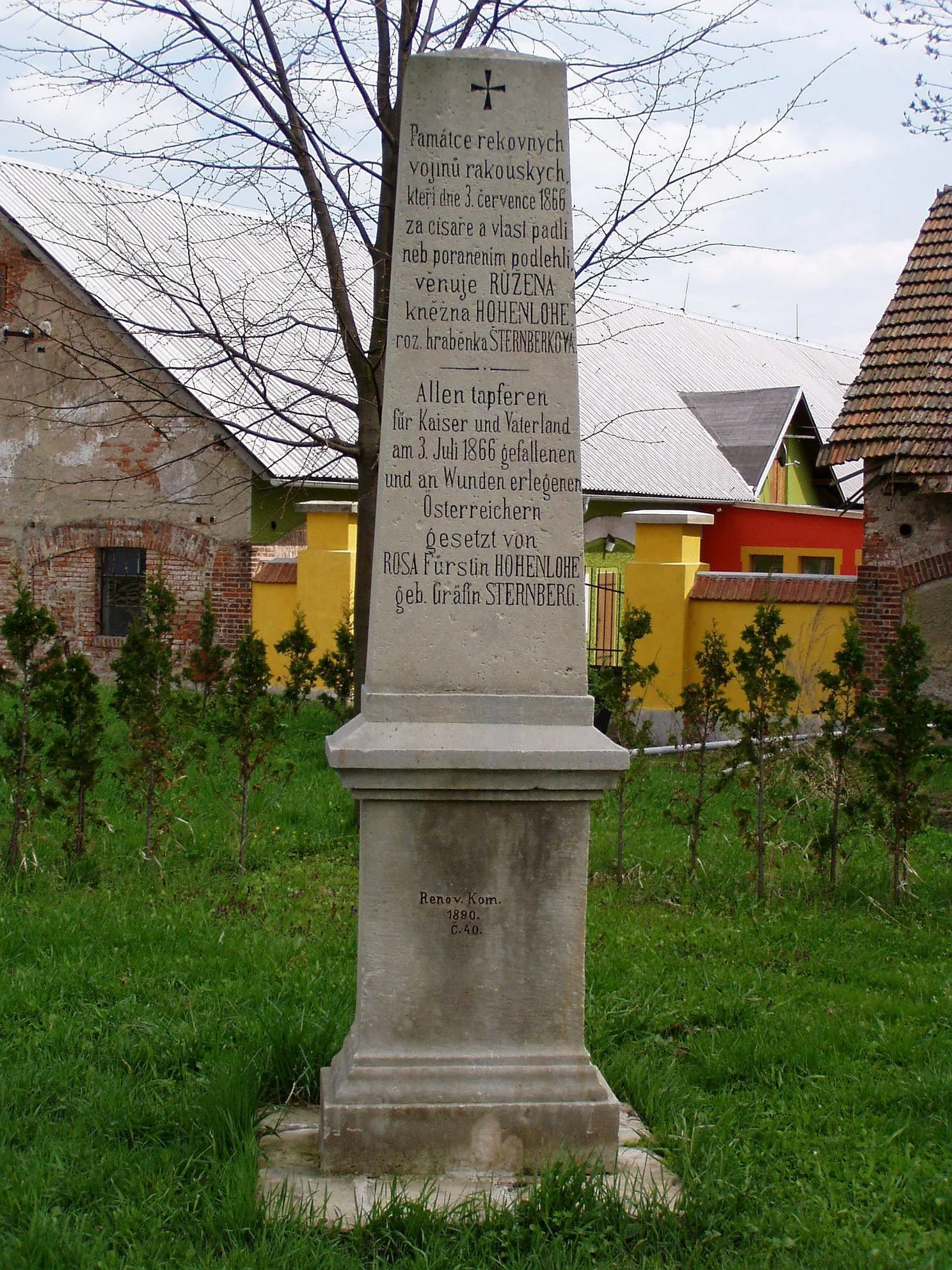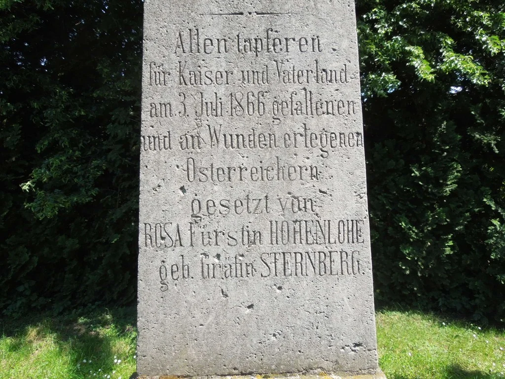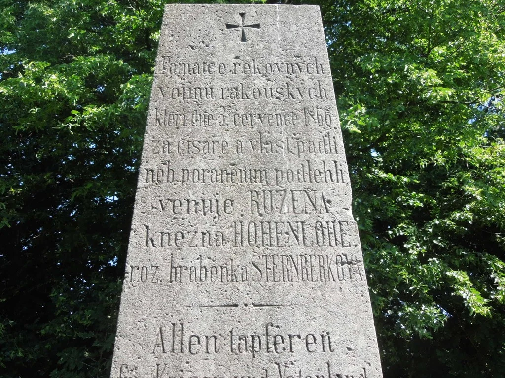 | Text na památce: | Čelní strana: \ Památce rekovných vojínů rakouských kteří dne 3. července 1866 za císaře a vlast padli neb poraněním podlehli, věnuje Růžena kněžna HOHENLOHE, roz. hraběnka ŠTERNBERKOVÁ. \ Allen tapferen für Kaiser und Vaterland am 3. Juli 1866 gefallenen und an Wunden erlegenen österreichern gesetzt von ROSA Furstin HOHENLOHE geb. Gräfin STERNBERG. \ Renov. Kom. 1890. Č. 40. \ |