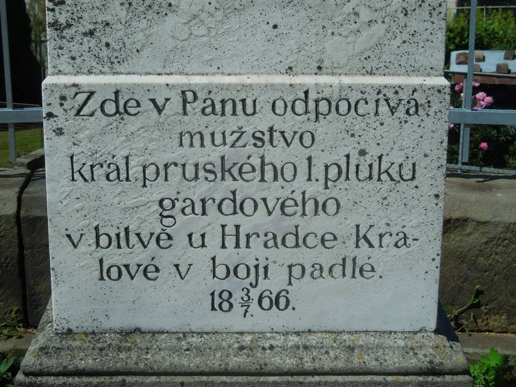Čelní strana: \ Hier ruhen in Gott die gefallenen Mannschaften des Preussischen 1 – Garde – Dragoner – Regiments. \ Zde v Pánu odpočívá mužstvo král. pruského 1. pluku gardového v bitvě u Hradce Krá – lové v boji padlé. 18 3./7. 66. \ Pravá strana: \ Renov. 1890. Č. 49. \