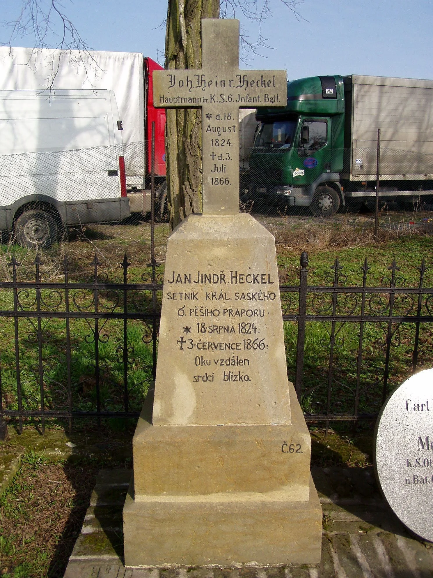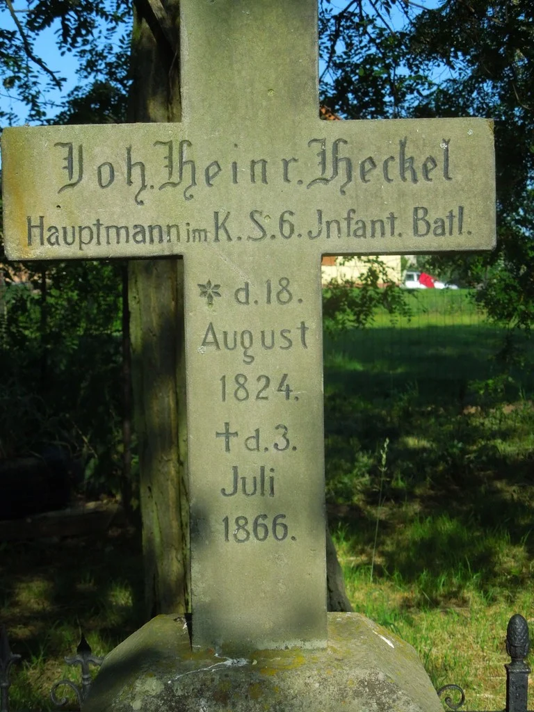 | Text na památce: | Čelní strana kříže: \ Joh. Heinr. Heckel Hauptmann im K.S. 6. Infant. Batl. * d. 18. August 1824 † d. 3. Juli 1866 \ Čelní strana hranolu: \ JAN JINDŘ. HECKEL SETNÍK KRÁL. SASKÉHO 6. PĚŠÍHO PRAPORU *18. SRPNA 1824 † 3. ČERVENCE 1866 / Oku vzdálen srdci blízko. \ Č 62. \ Čelní strana kříže: \ Joh. Heinr. Heckel Hauptmann im K.S.6.Infant. Batl. d.18. August 1824 \ Čelní strana: \ Fiel in der Schlacht bei Königgrätz den 3. Juli 1866. \ Dále zakryto vegetací: \ Ren……. …………… \ |