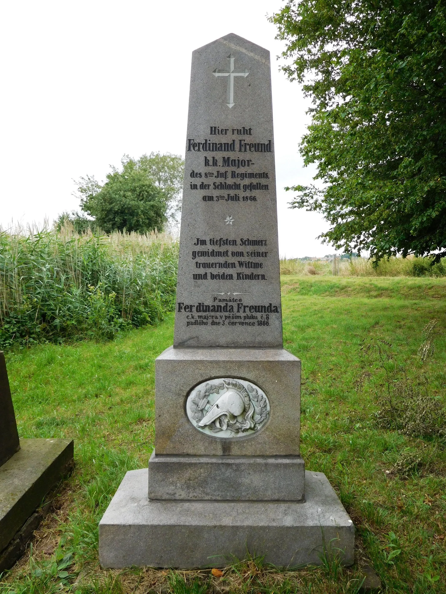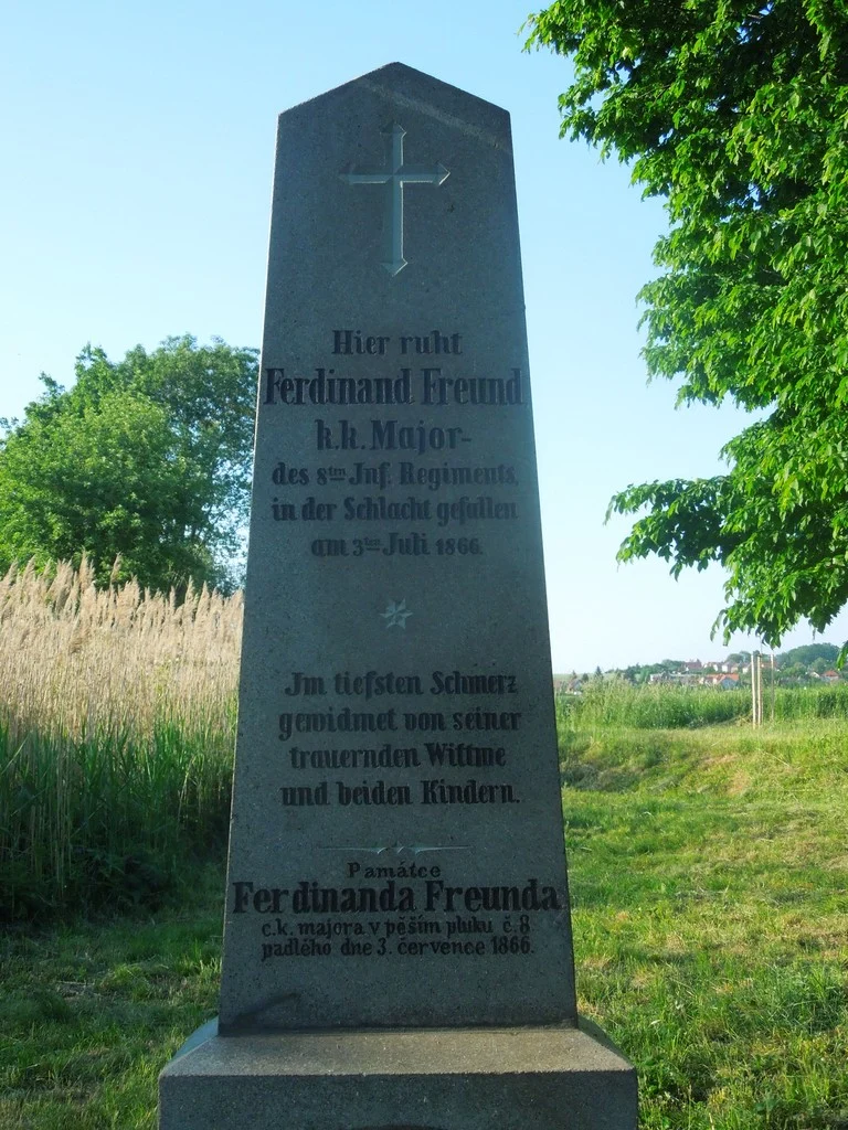 Čelní strana: \ Hier ruht Ferdinand Freund k.k. Major- des 8ten Inf. Regiments, in der Schlacht gefallen am 3ten Juli 1866. \ Im tiefsten Schmerz gewidmet von seiner trauernden Wittwe und beiden Kindern. \ Památce Ferdinanda Freunda c.k. majora v pěším pluku č. 8 padlého dne 3. července 1866. \ Pravá strana: \ Renov. Kom. 1890. Č. 64. \
