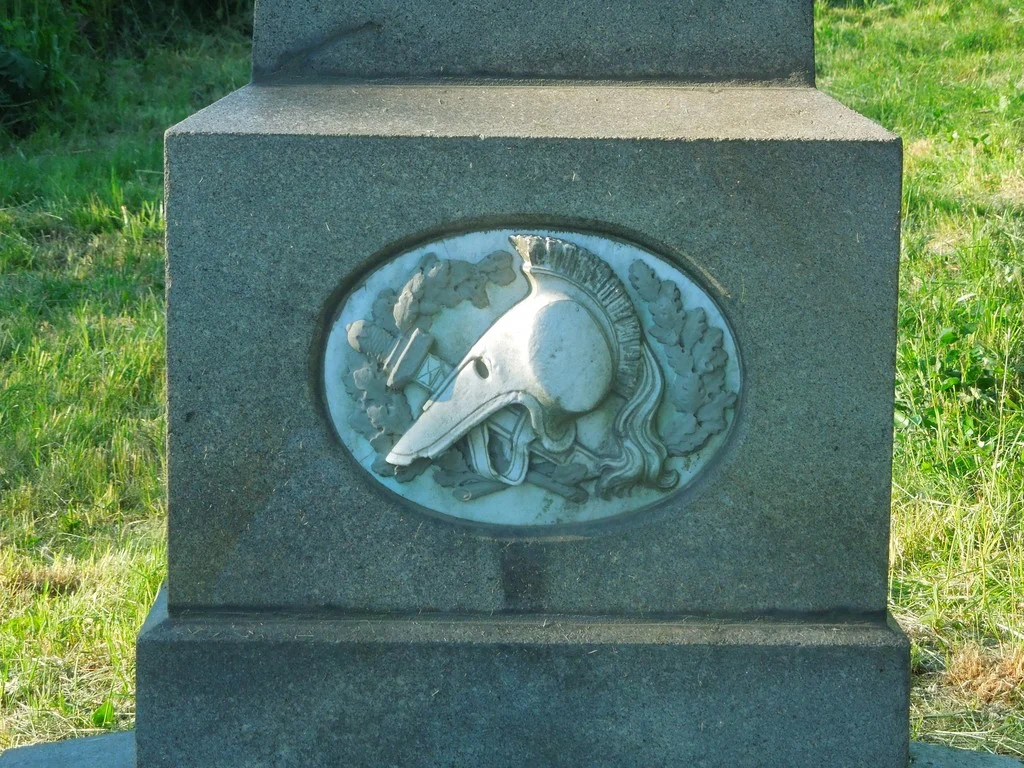 Vysoký žulový jehlanec s mramorovým medailonem s antickou přilbou a nápisy v českém a německém jazyce