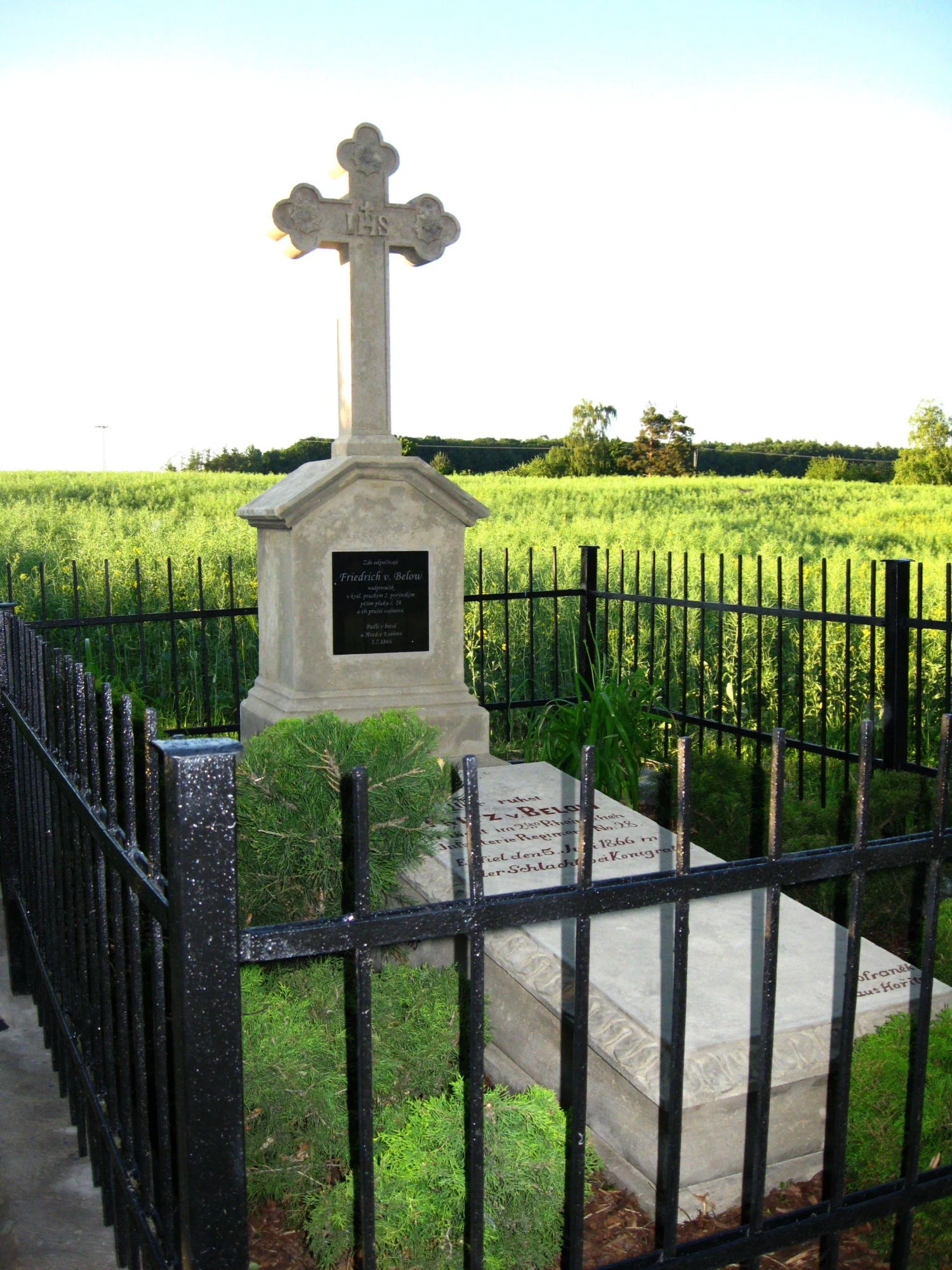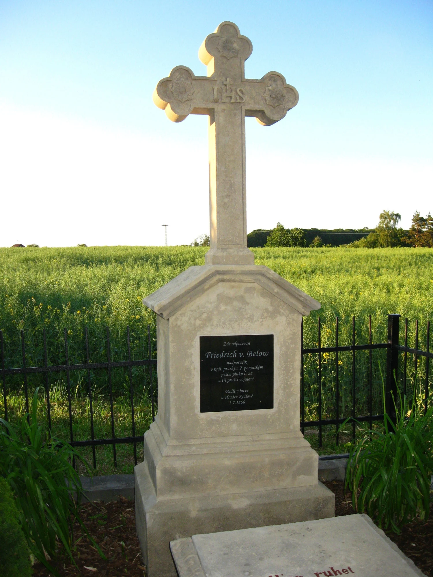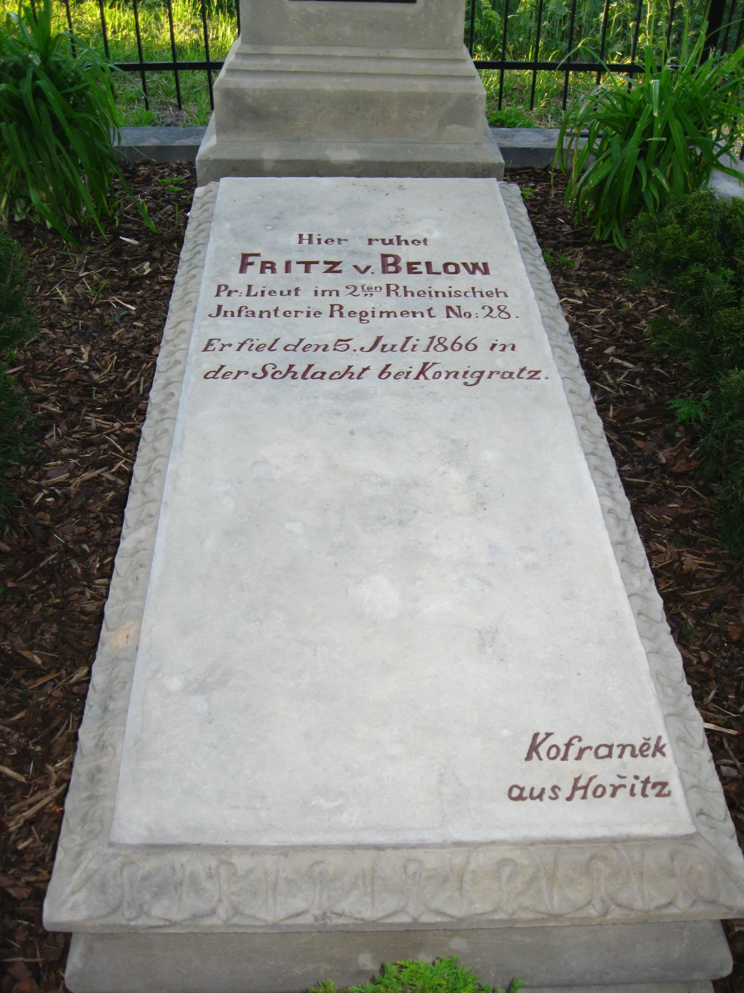 | Text na památce: | Čelní strana hranolu: nápisní deska: \ Zde odpočívají Friedrich v. Below nadporučík v král. pruském 2. porýnském pěším pluku č. 28 a tři pruští vojínové. Padli v bitvě u Hradce Králové 3. 7. 1866. \ Zadní strana: \ Renov. 1890 Č. 67 \ Záklopní deska: \ Hier ruhet Fritz v. Below Pr. Lieut. im 2ten Rheinischen Infanterie Regiment No. 28. Er fiel den 5. Juli 1866 in der Schlacht bei Königgrätz. Kofraněk aus Hořitz.\ Pravá strana záklopní desky: \ Bach \ Levá strana záklopní desky: \ Neihs \ Zadní strana záklopní desky: \ v. Hagen \ |