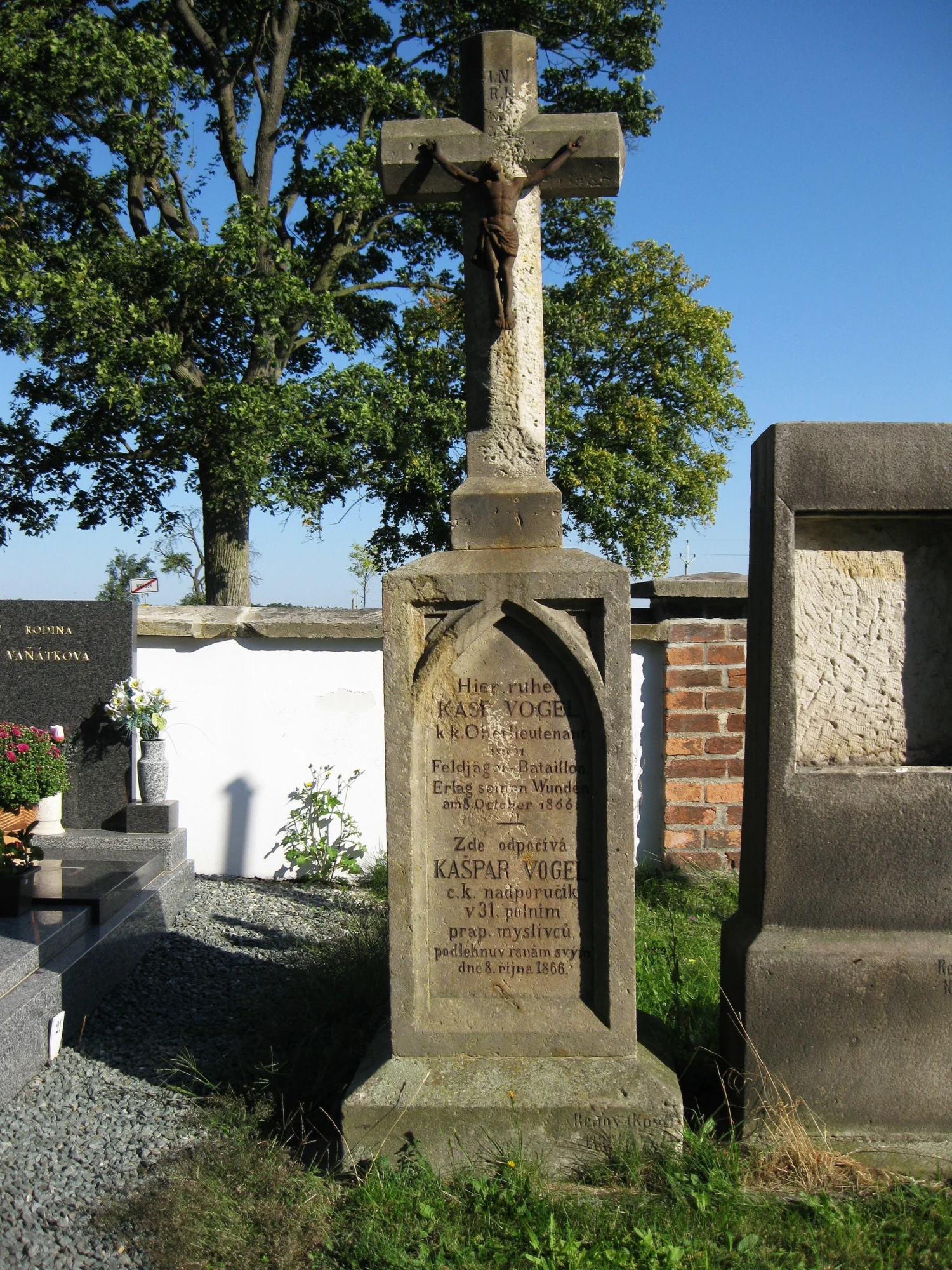 | Text na památce: | Čelní strana: \ Hier ruhet KASP. VOGEL k. k. Oberlieutenant im 31. Feldjäger – Bataillon. Erlag seinen Wunden am 8. October 1866. \ Zde odpočívá KAŠPAR VOGEL. c. k. nadporučík v 31. polním prap. myslivců, podlehnuv ranám svým dne 8. října 1866. \ Renov. (Kom.) 1889. Č. 74. \ |
