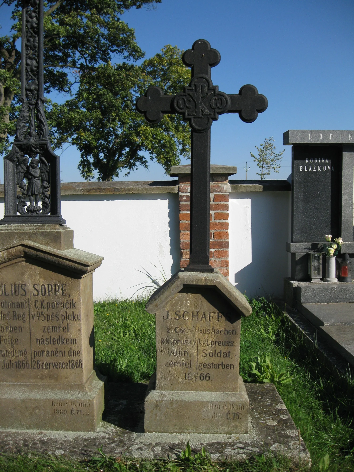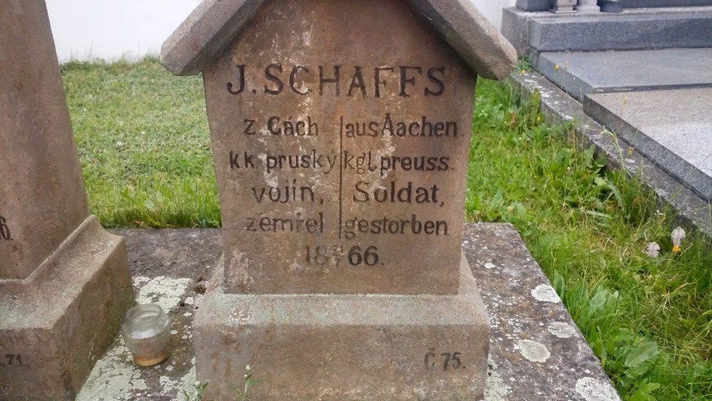 | Text na památce: | Čelní strana: \ J. SCHAFFS z Cách. ↔ aus Aachen. kr. pruský ↔ kgl. preuss. vojín, ↔ Soldat, zemřel ↔ gestorben 18 31/7 66. \ Renov. (Kom.) 1889. Č. 75. \ |