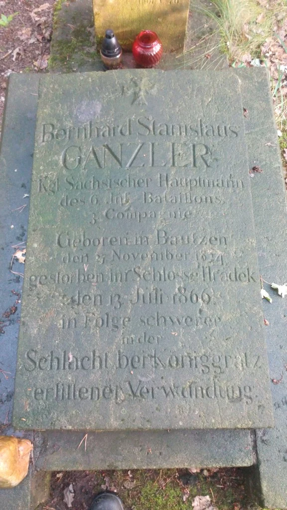 | Volný překlad: | Bernhard Stanislaus Ganzler, královský saský setník v 6. pěším praporu, 3. setnině. Narozen v Bautzenu 27. listopadu 1824, zemřel v zámku Hrádek 13. července 1866 na následky těžkého zranění utrpěného v bitvě u Hradce Králové. |