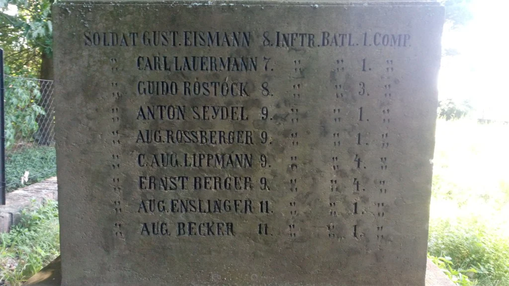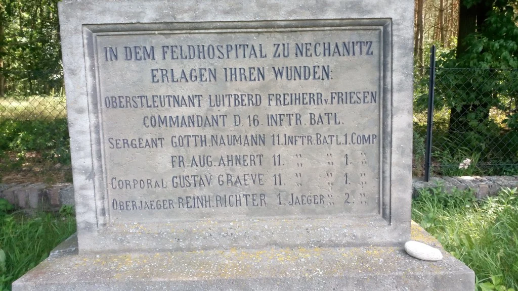 | Text na památce: | Čelní strana obelisku: \ SACHSENS TAPFEREN SOEHNEN DAS VATERLAND. 1866. \ Čelní strana hranolu: \ IN DEM FELDHOSPITAL ZU NECHANITZ ERLAGEN IHREN WUNDEN: OBERSTLEUTNANT LUITBERD FREIHERR V. FRIESEN COMMANDANT D. 16. INFTR. BATL. SERGEANT GOTTH. NAUMANN 11. INFTR. BATL. 1. COMP. „ (stejnítko pro SEGREANT) FR. AUG. AHNERT 11. „ (stejnítko pro INFTR.) „ (stejnítko pro BATL.) 1. „ (stejnítko pro COMP.) CORPORAL GUSTAV GRAEVE 11. „ (stejnítko pro INFTR.) „ (stejnítko pro BATL.) 1. „ (stejnítko pro COMP.) OBERJAEGER REINH. RICHTER 1. JAEGER „ (stejnítko pro BATL.) 2. „ (stejnítko pro COMP.) \ Čelní strana druhého stupně: \ CHRABRÝM VOJÍNUM SASKÝM VLAST. 1866. \ Levá strana hranolu: \ SOLDAT GUST.EISMANN 8. INFTR. BATL. 1. COMP. „ (8 stejnítek pro SOLDAT) CARL LAUERMANN 7. „ (stejnítko pro INFTR) „ (stejnítko pro BATL. – 8x) 1. „ (stejnítko pro COMP. – 8 x) „ GUIDO ROSTOCK 8. „ „ 3. „ „ ANTON SEYDEL 9. „ „ 1. „ „ AUG. ROSSBERGER 9. „ „ 1. „ „ C. AUG.LIPPMANN 9. „ „ 4. „ „ ERNST BERGER 9. „ „ 4. „ „ AUG. ENSLINGER 11. „ „ 1. „ AUG. BECKER 11. „ „ 1. \ Zadní strana hranolu: \ SOLDAT CARL KATEHITSCH 11. INFTR. BATL. 2.COMP. „ (stejnítko pro SOLDAT – 2x) FR. ANT. SCHUBERT 14. „ (stejnítko pro INFTR. – 2x) „ (stejnítko pro BATL. – 2x) 1. „ (stejnítko pro COMP. – 2x) „ OTTO ZINKE 16. „ „ 1. „ JAEGER FRIBOR. FLOSS 2. JAEGER „ (stejnítko pro BATL.) 4. „ (stejnítko pro COMP.) „ (stejnítko pro JAEGER – 5x) ERNST RESSLER 3. „ (stejnítko 5x JAEGER) „ (stejnítko pro BATL. – 5x) 1. „ (stejnítko pro COMP. – 5x) „ JUL. RIEDEL 3. „ „ 1. „ „ HEINR.FEISTE 3. „ „ 1. „ „ JOHANN KRANZ 3. „ „ 2. „ „ BRUNO KIESSLING 3. „ „ 4. „ \ Zadní strana horní římsy hranolu: \ gef.Emil Noël Dresden \ Pravá strana hranolu: \ CORPORAL CARL MOR.GROLL GARDE REIT.REG.2.SCHW. VICECORP. HEINR. WEIGELT 9. INFTR. BATL. 1. COMP. SOLDAT ERNST ROENSCH 3. „ (stejnítko pro INFT. – 7 x) „ (stejnítko pro BATL. – 7x) 1. „ (stejnítko pro COMP. – 7 x) „ (před jménem stejnítko pro SOLDAT – 6x) CARL LEHMANN 3. „ „ 2. „ „ AUG. BARTKOW 3. „ „ 3. „ „ REINH. SCHUSTER 4. „ „ 3. „ „ FR. AUG. HEINSIEG 5. „ „ 1. „ „ GOTTL. HEMPEL 5. „ „ 2. „ „ FR.BERN.SCHUBERT 7. „ „ 1. „ \ Pravá strana druhého stupně: \ Renov. 1889. Č.82. \ |