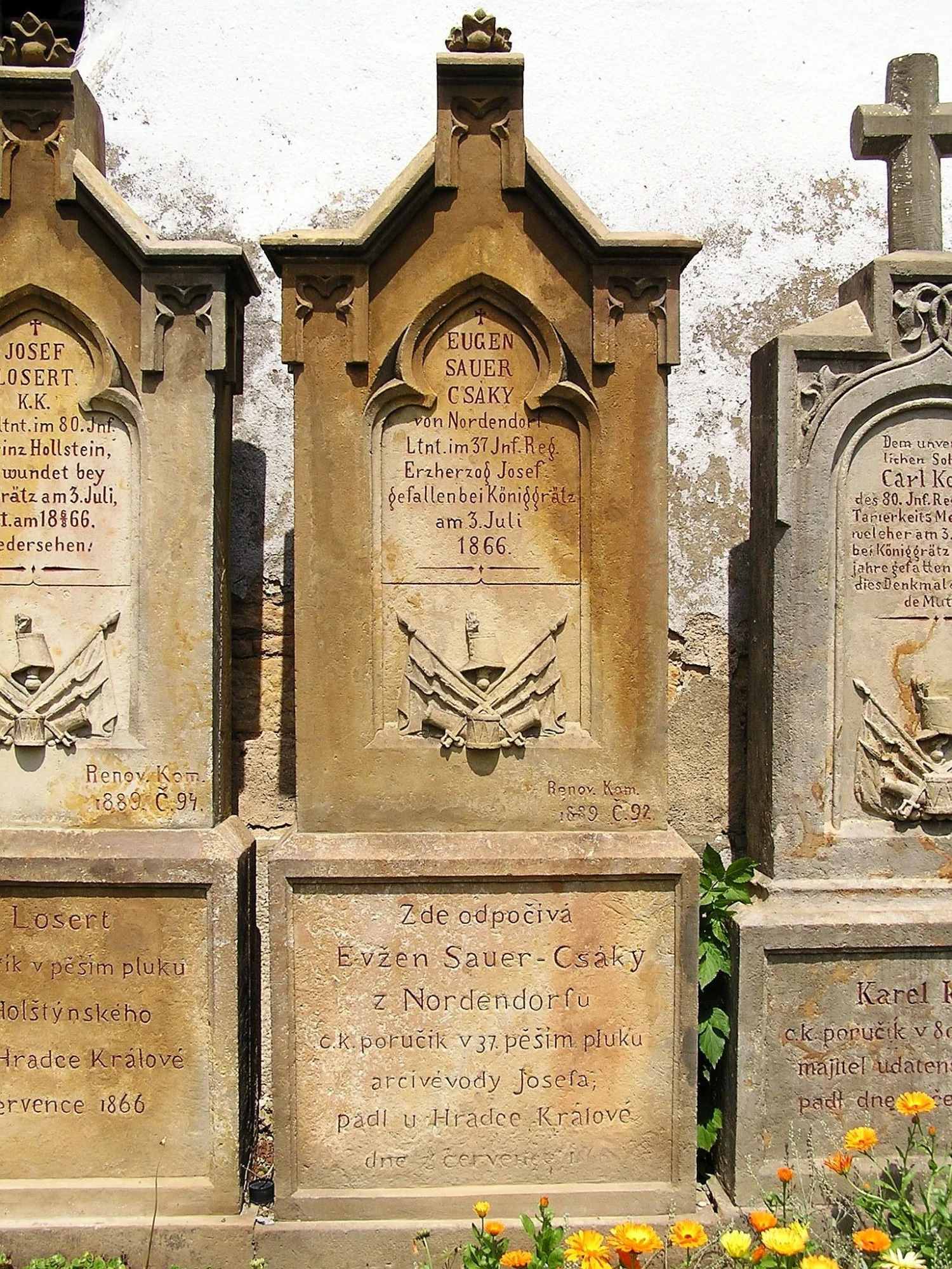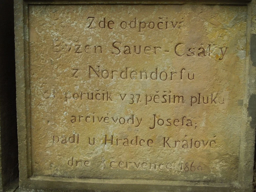 Čelní strana: \ EUGEN SAUER CSÁKY von Nordendorf Ltnt. im 37 Inf. Reg. Erzherzog Josef gefallen bei Königgrätz am 3. Juli 1866. \ Renov. Kom. 1889. Č.92. \ Zde odpočívá Evžen Sauer – Csáky z Nordendorfu c.k. poručík v 37. pěším pluku arcivévody Josefa, padl u Hradce Králové dne 3. července 1866. \