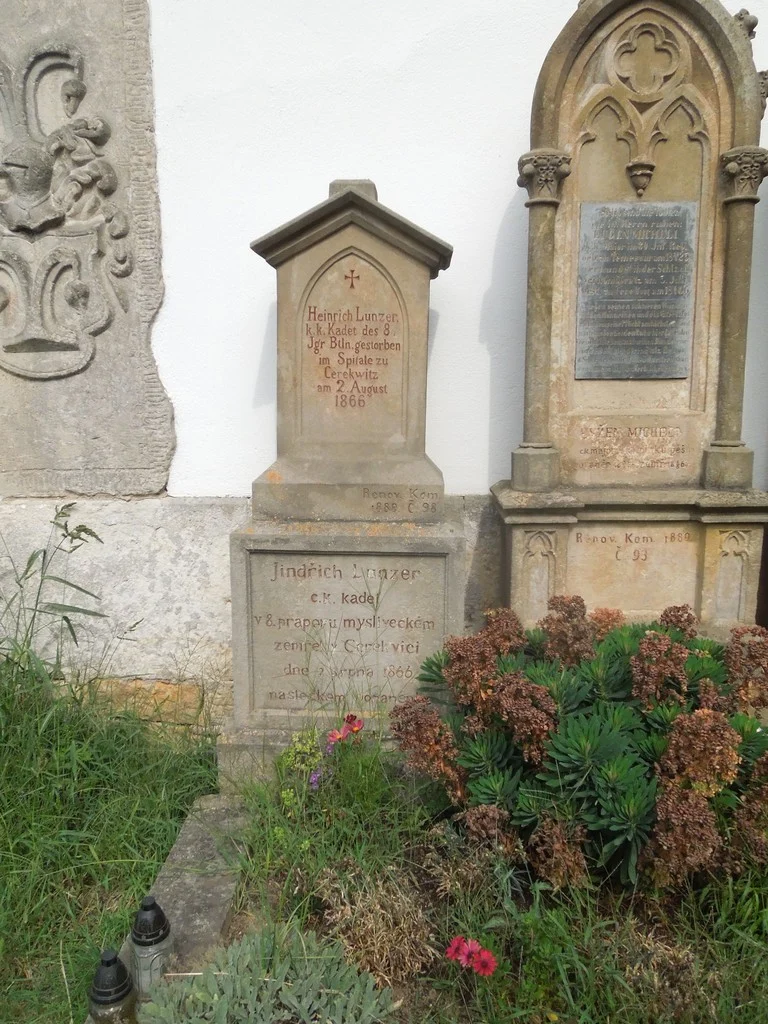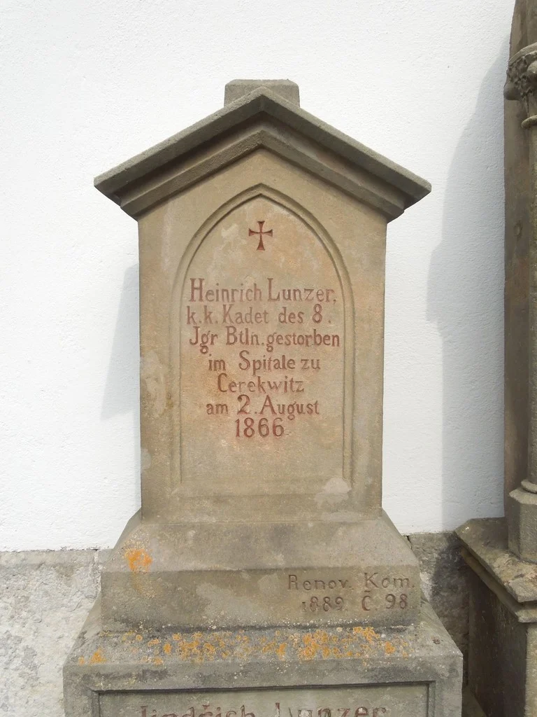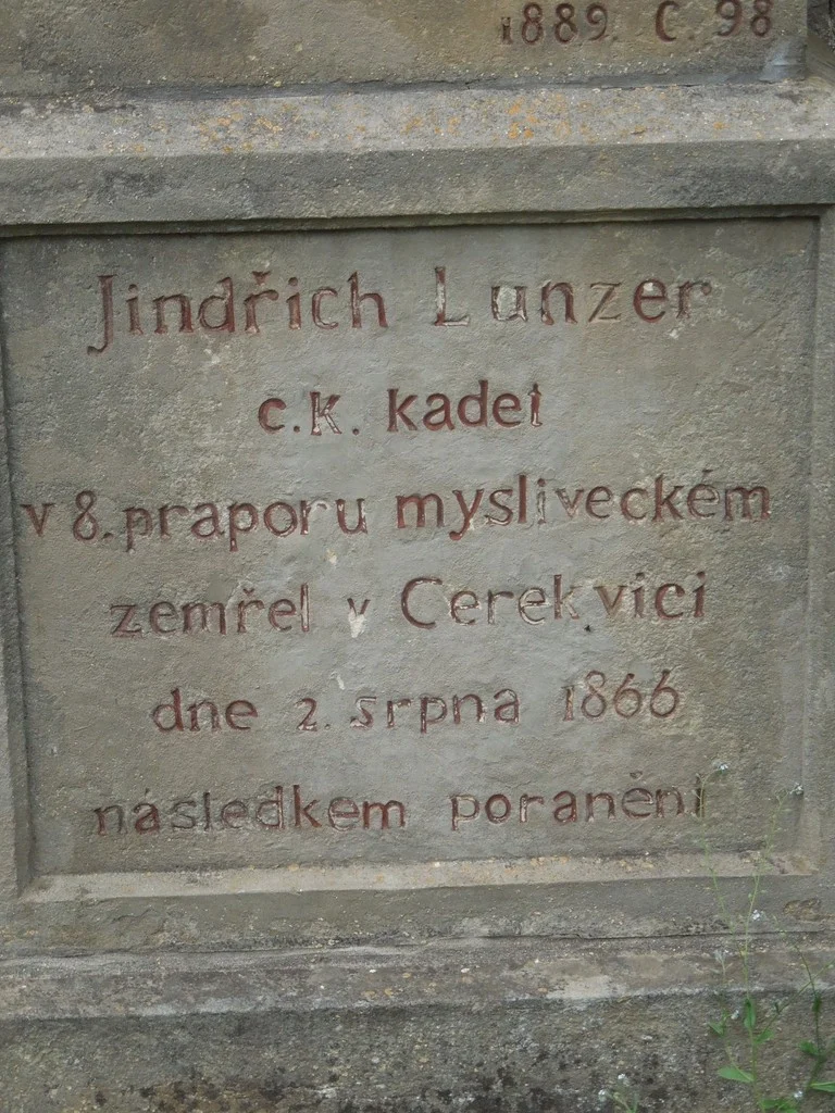 | Text na památce: | Čelní strana: \ Heinrich Lunzer, k.k. Kadet des 8. Jgr. Btln. gestorben im Spitale zu Cerekwitz am 2. August 1866. \ Renov. Kom. 1889. Č.98. \ Jindřich Lunzer c.k. kadet v 8. praporu mysliveckém zemřel v Cerekvici dne 2. srpna 1866 následkem poranění. \ |