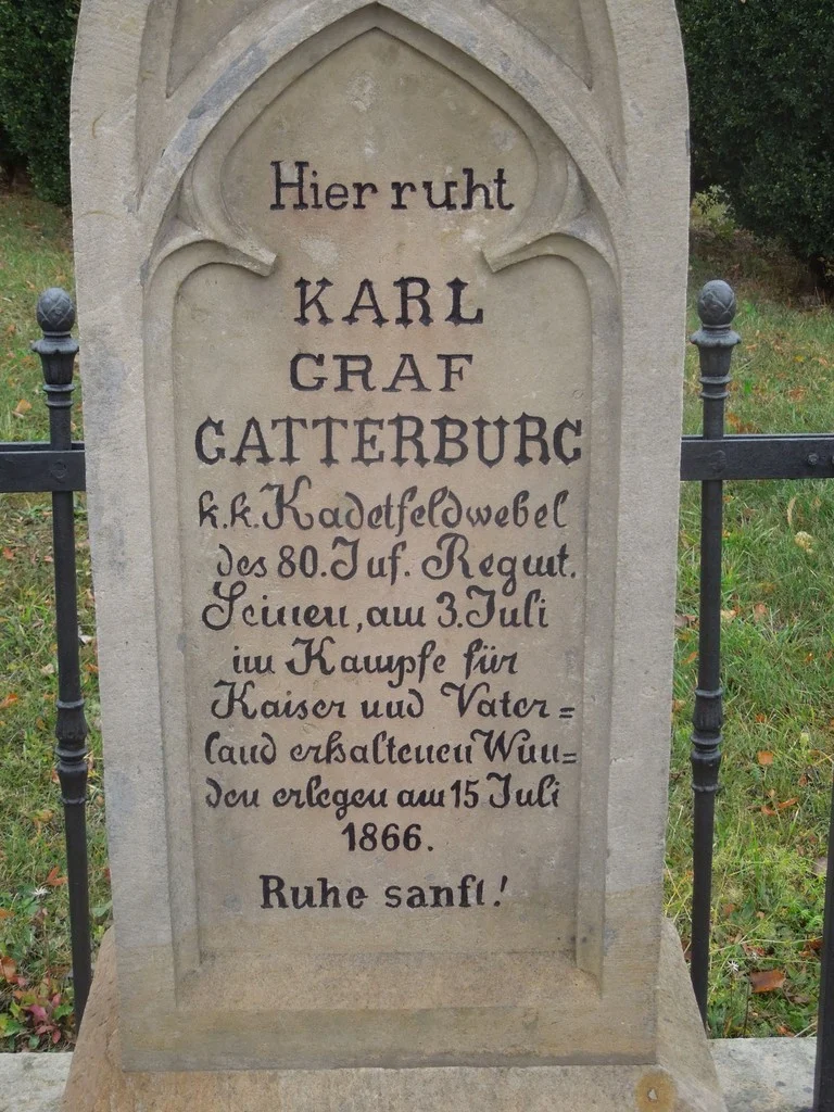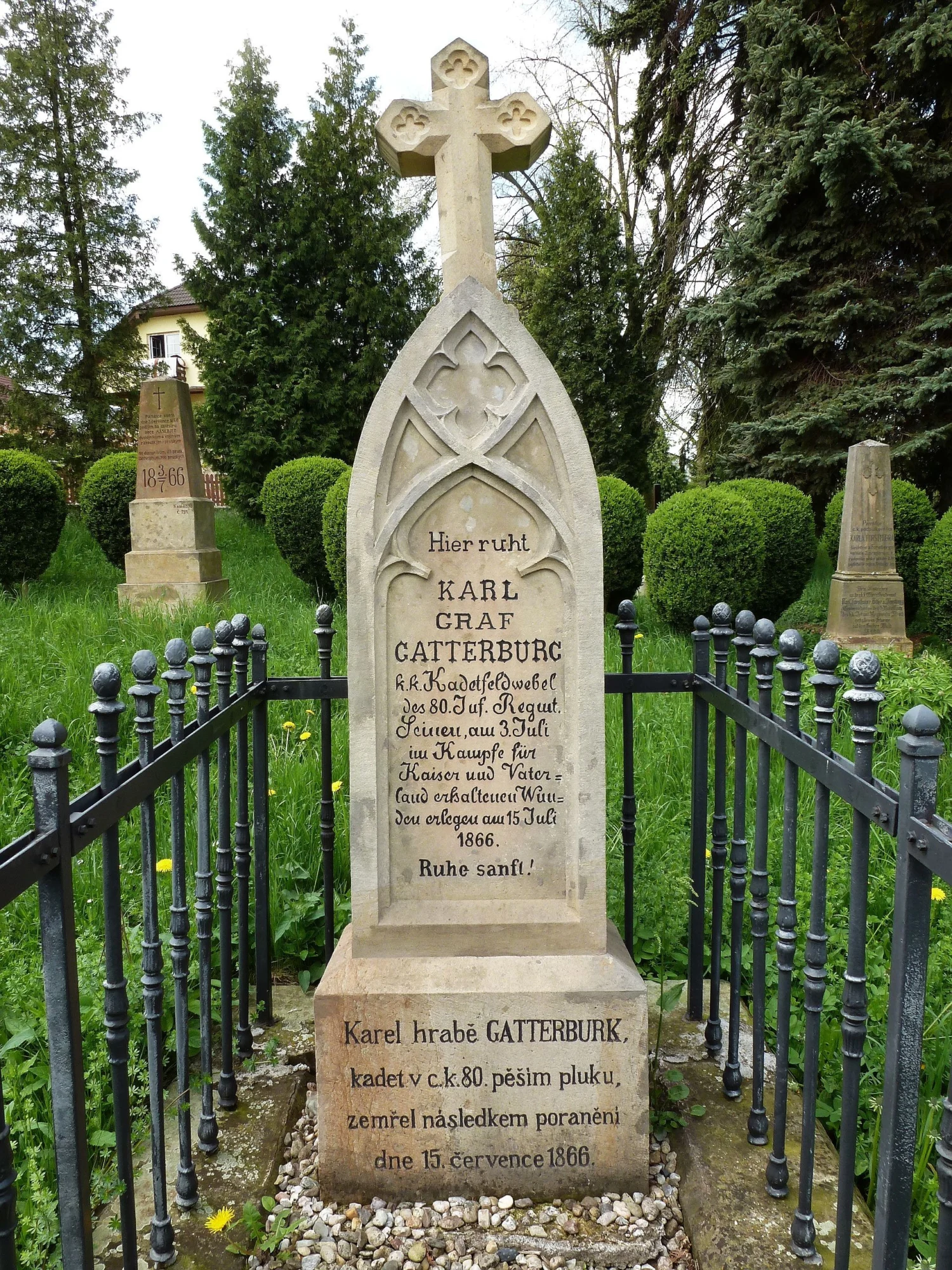 | Text na památce: | Čelní strana: \ Hier ruht KARL GRAF GATTERBURG k.k. Kadetfeldwebel des 80.Inf. Regmt. Seinen, am 3. Juli im Kampfe für Kaiser und Vater = land erhaltenen Wun = den erlegen am 15. Juli 1866. Ruhe sanft! \ Karel hrabě GATTERBURK, kadet v c.k.80. pěším pluku, zemřel následkem poranění dne 15. července 1866. \ Pravá strana: \ Renov. (Kom.) 1889. Č. 101. \ |