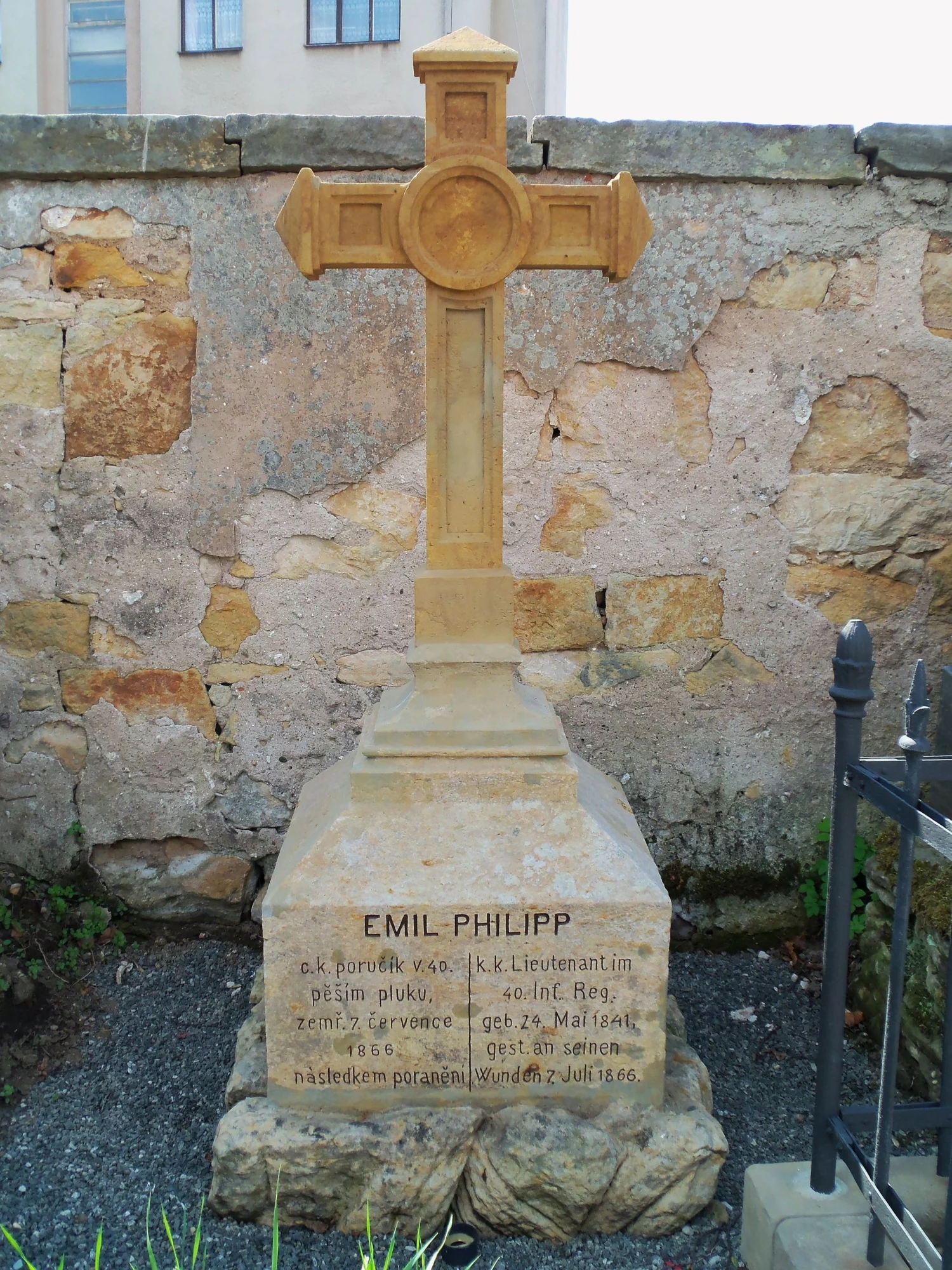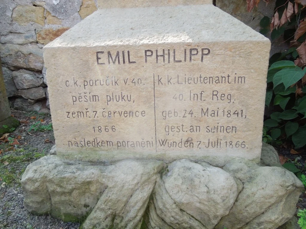 | Text na památce: | Čelní strana: \ EMIL PHILIPP c. k. poručík v 40. ↔ k. k. Lieutenant im pěším pluku, ↔ 40. Inf. Reg. zemř. 7. července ↔ geb. 24. Mai 1841, 1866 gest. An seinen následkem poranění. ↔ Wunden 7. Juli 1866. \ (Renov. Kom.) 1889 Č. 108 \ |