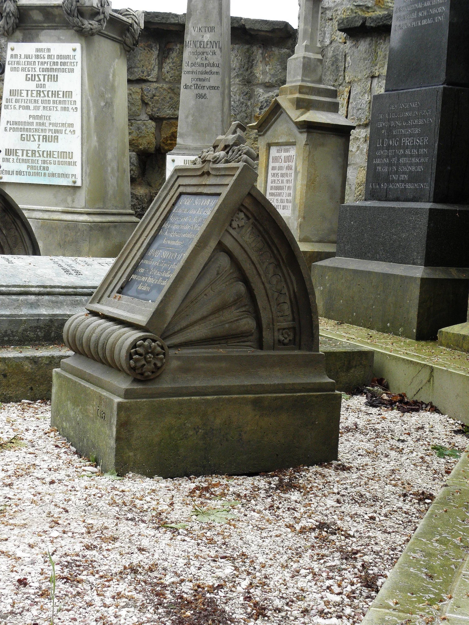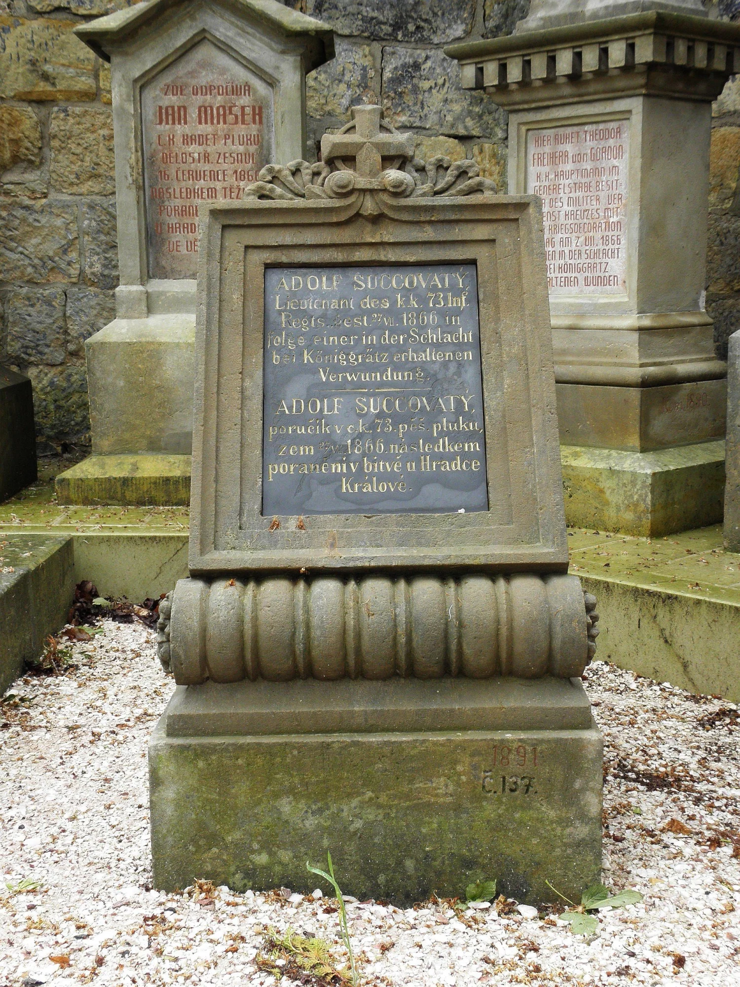 | Text na památce: | Čelní nápisní deska: \ ADOLF SUCCOVATY, Lieutenant des k.k. 73. Inf. Regts., gest. 27 / VII. 1866 in folge einer in der Schlacht bei Königgrätz erhaltenen Verwundung. \ ADOLF SUCCOVATY, poručík v c.k. 73. pěš. pluku, zem. 27 / VII. 1866. následkem poranění v bitvě u Hradce Králové. \ Levá a pravá strana: \ MDCCCXCI \ Čelní strana soklu: \ 1891 Č. 137. \ |