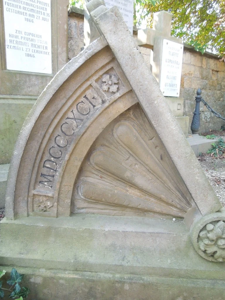 | Popis památky: | Pískovcový antikizující pultový pomník, zdobený reliéfy, s nápisní deskou z břidlice o rozměru 29 x 36 cm. Nápisy v českém a německém jazyce. |