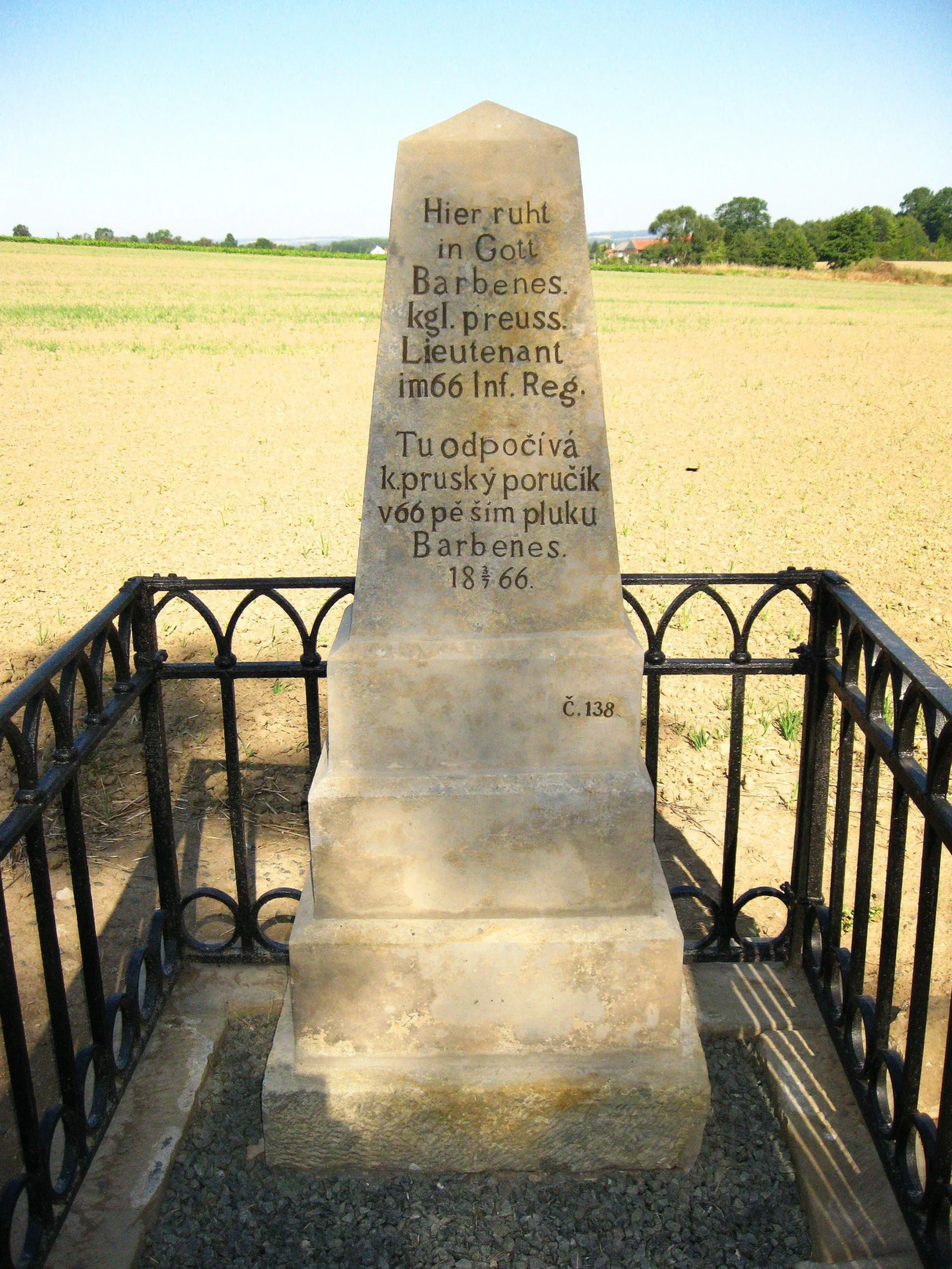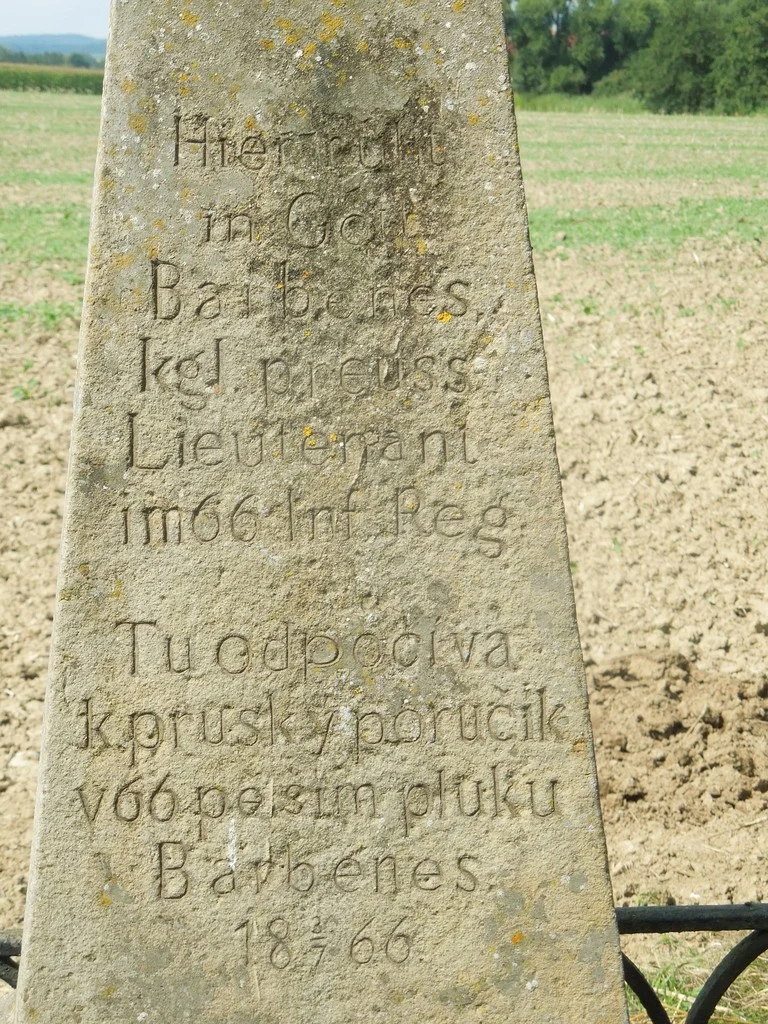 | Text na památce: | Čelní strana: \ Hier ruht In Gott Barbenes kgl. preuss. Lieutenant im. 66. Inf. Reg. \ Tu odpočívá k. pruský poručík v 66. pěším pluku Barbenes. 18 3./ 7. 66. \ č. 138. \ |