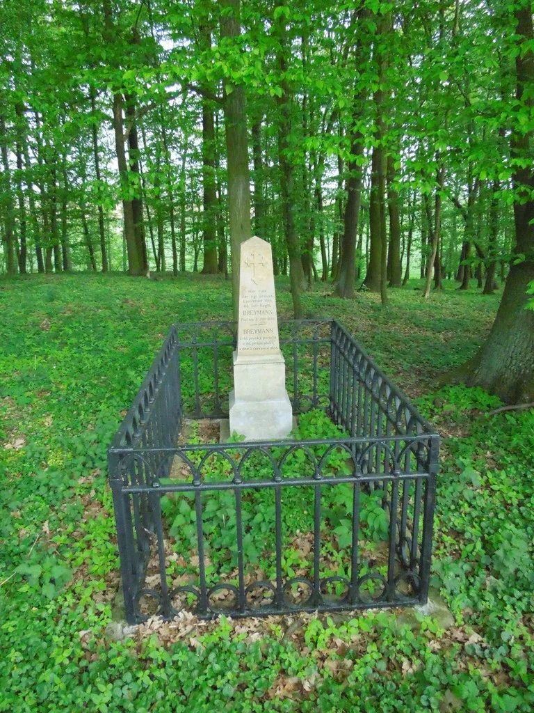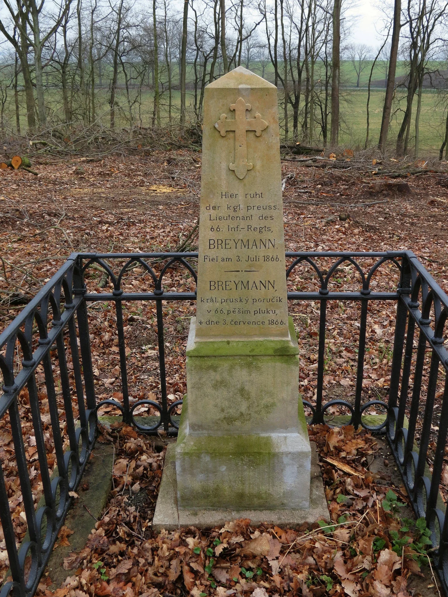 | Text na památce: | Čelní strana: \ Hier ruht der kgl. preuss. Lieutenant des 66. Inf. Regts. BREYMANN Fiel am 3. Juli 1866. \ BREYMANN král. pruský poručík v 66. pěším pluku dne 3. července 1866. \ Levá strana: \ Kom. 1889. č. 139. \ |