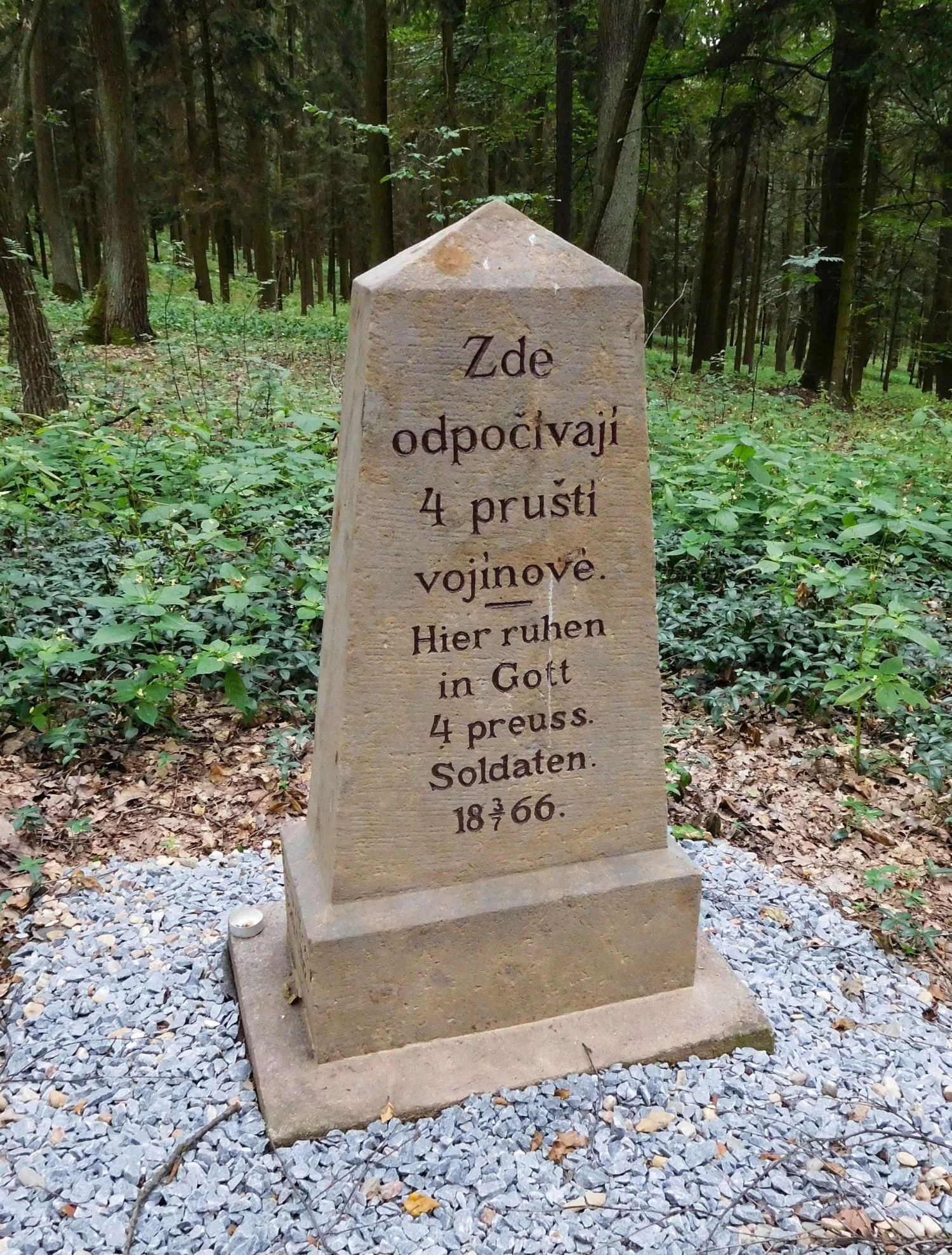 | Text na památce: | Čelní strana: \ Zde odpočívají 4 pruští vojínové. Hier ruhen in Gott 4 preuss. Soldaten. 18 3/7 66. \ Levá strana: \ Renov. (Kom.) 1889. Č. 152. \ |