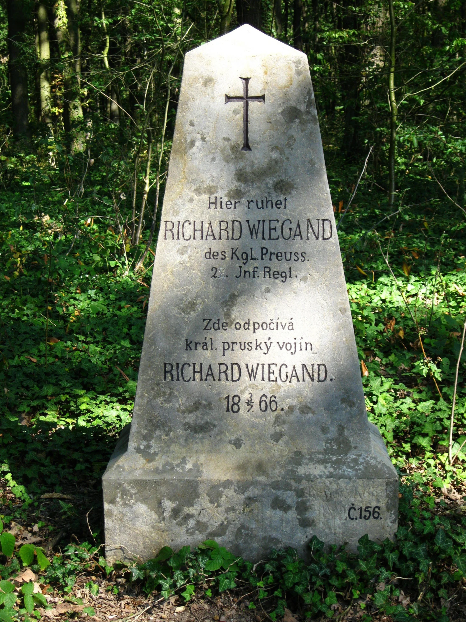 | Text na památce: | Čelní strana: \ Hier ruhet RICHARD WIEGAND des Kgl. Preuss. 27. Inf. Reg. \ Zde odpočívá král. pruský vojín RICHARD WIEGAND 18 3./7. 66. \ Renov. (Kom.) 1889. Č.156. \ |