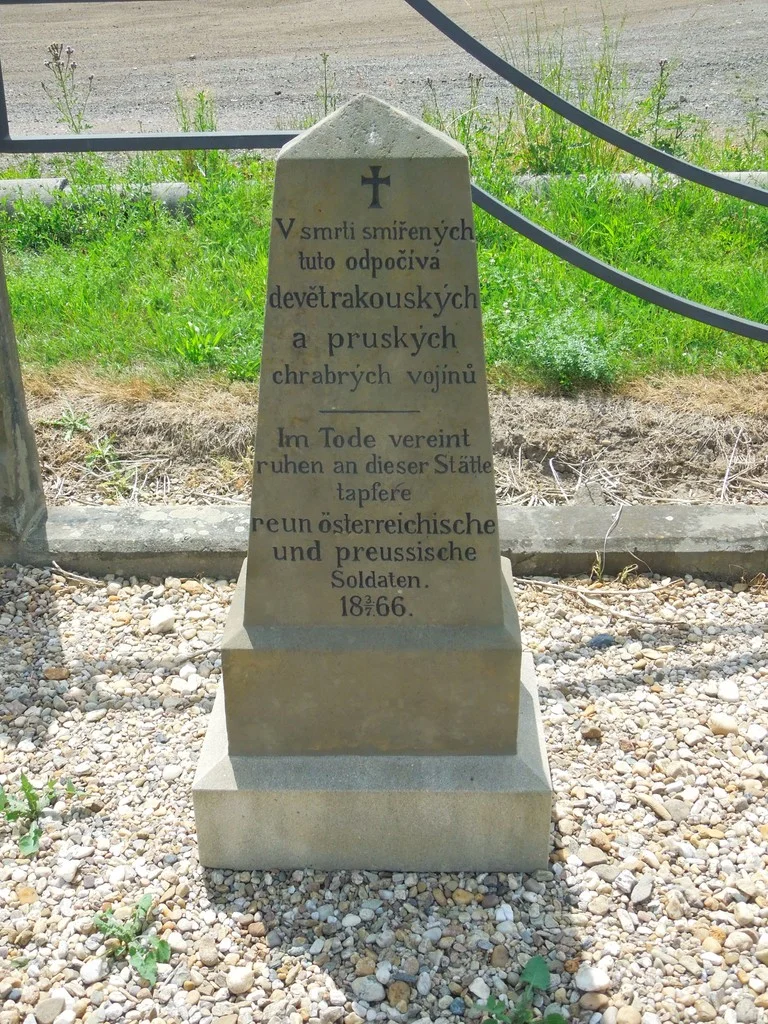 | Text na památce: | Čelní strana: \ V smrti smířených tuto odpočívá devět rakouských a pruských chrabrých vojínů \ Im Tode vereint ruhen an dieser Stätte tapfere neun österreichische und preussische Soldaten. 18 3./7. 66. \ Pravá strana: \ Č. 164. \ |