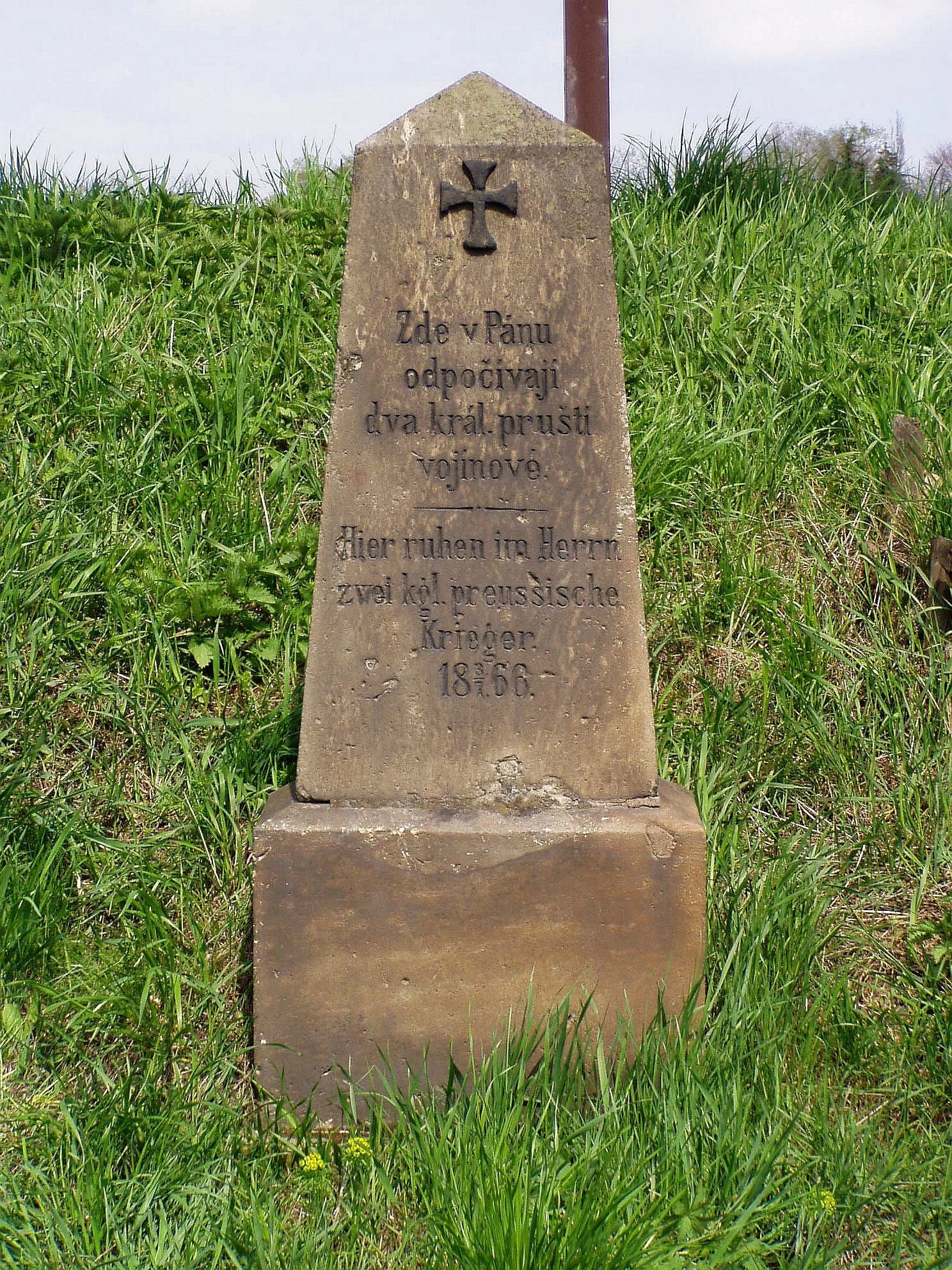 | Text na památce: | Čelní strana: \ Zde v Pánu odpočívají dva král. pruští vojínové. \ Hier ruhen im Herrn zwei kgl. preussische Krieger. \ 18 3/7 66. \ |