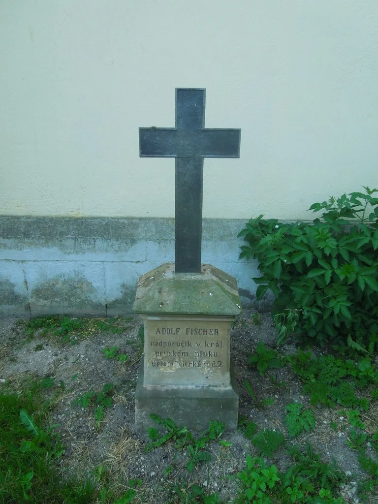 | Text na památce: | Čelní strana: \ ADOLF FISCHER nadporučík v král. pruském pluku dělostřeleckém č. 2. 18 3/7 66. \ Pravá strana: \ Renov. Kom. 1890. Č. 180. \ |