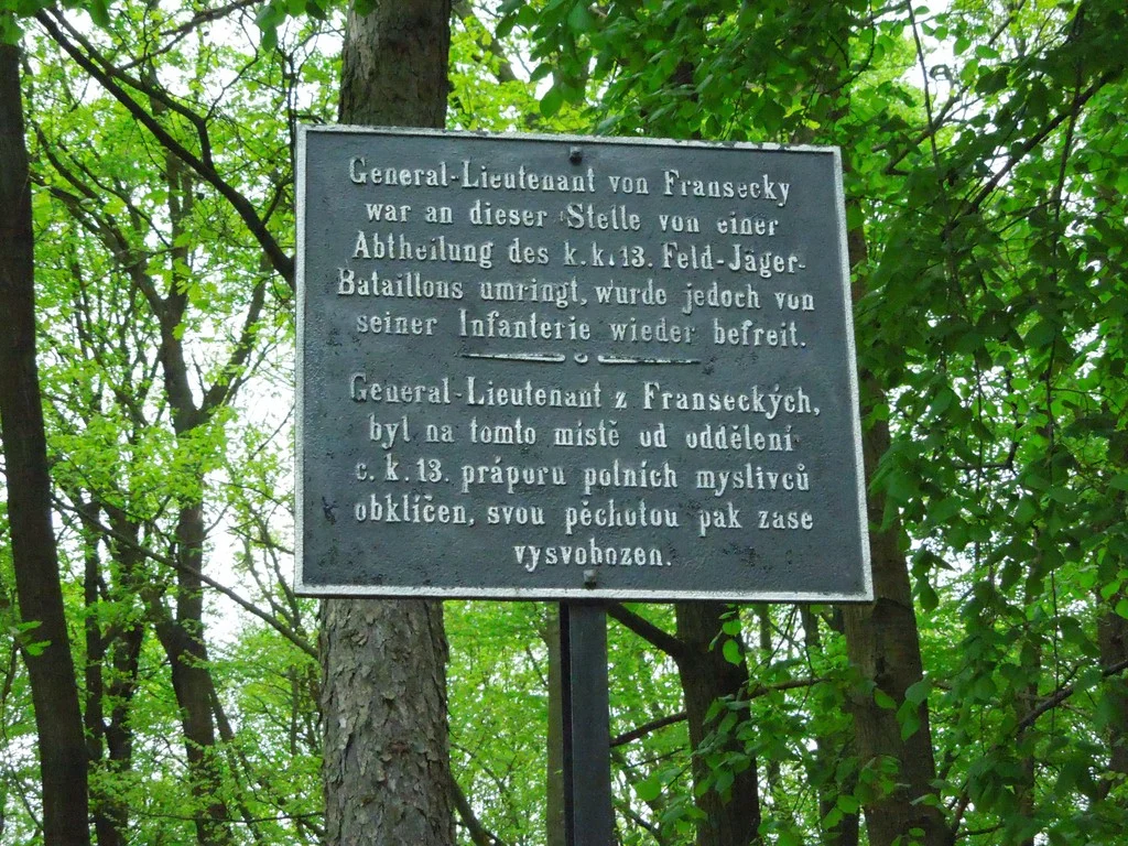 | Text na památce: | Litinová deska: \ General – Lieutenant von Fransecky war an diesel Stelle von einer Abtheilung des k. k. 13. Feld-Jäger- Bataillons umringt, wurde jedoch von seiner Infanterie wieder befreit. \ General – Lieutenant z Franseckých, byl na tomto místě od oddělení c. k. 13. praporu polních myslivců obklíčen, svou pěchotou pak zase vysvobozen. \ |