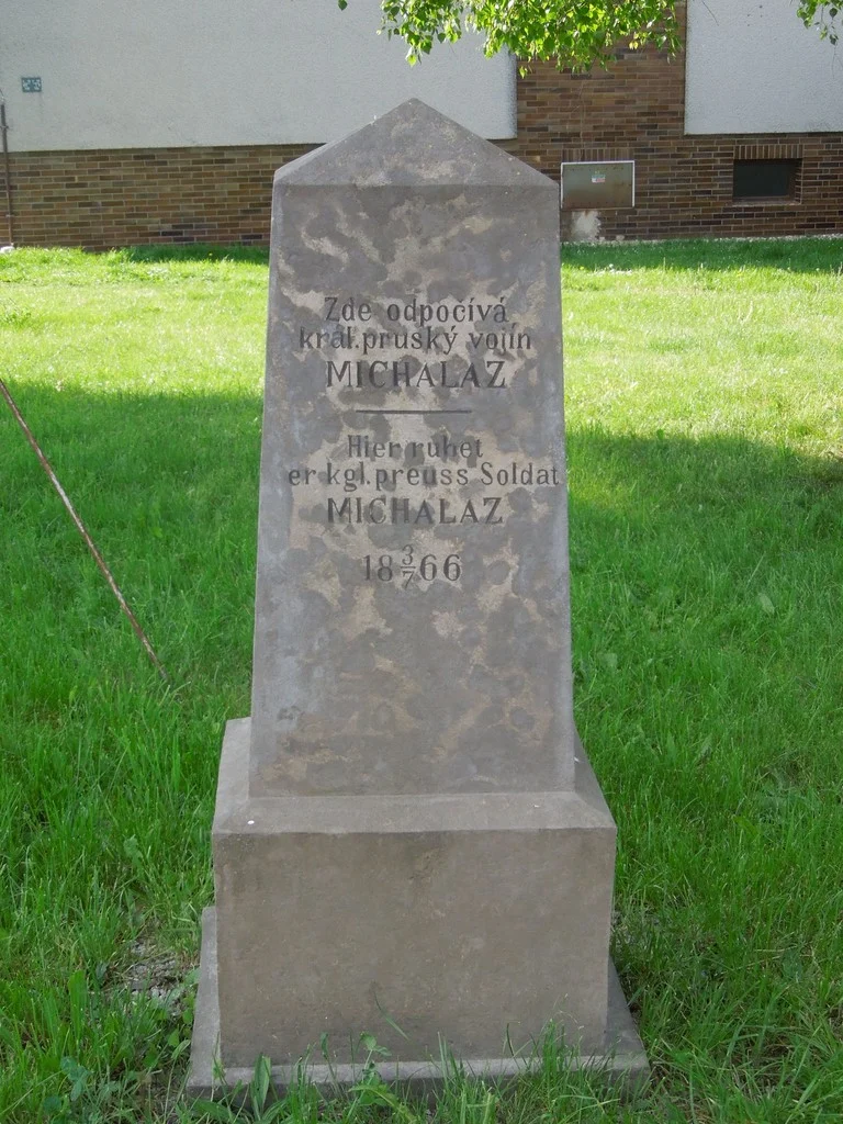 Čelní strana: \ Zde odpočívá král. pruský vojín MICHALAZ \ Hier ruhet der kgl. preuss. Soldat MICHALAZ \ 18 3/7 66. \ Pravá strana pyramidy: \ Renov. 1890. Č. 189. \