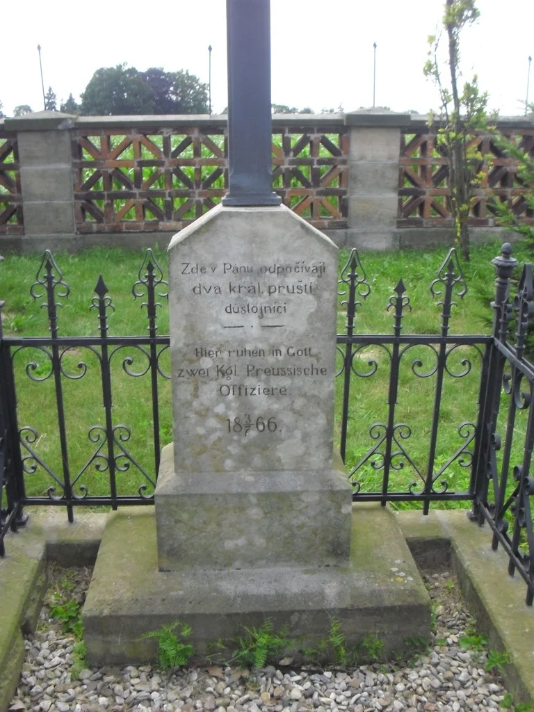 | Text na památce: | Čelní strana: \ Zde v Pánu odpočívají dva král. pruští důstojníci. \ Hier ruhen in Gott zwei Kgl. Preussische Offiziere. \ 18 3./7. 66. \ Pravá strana: \ Renov. 1906 Čís. 203. \ |