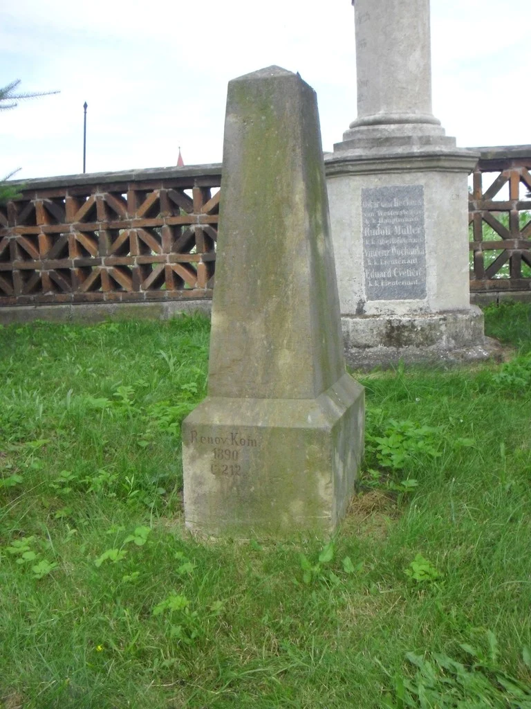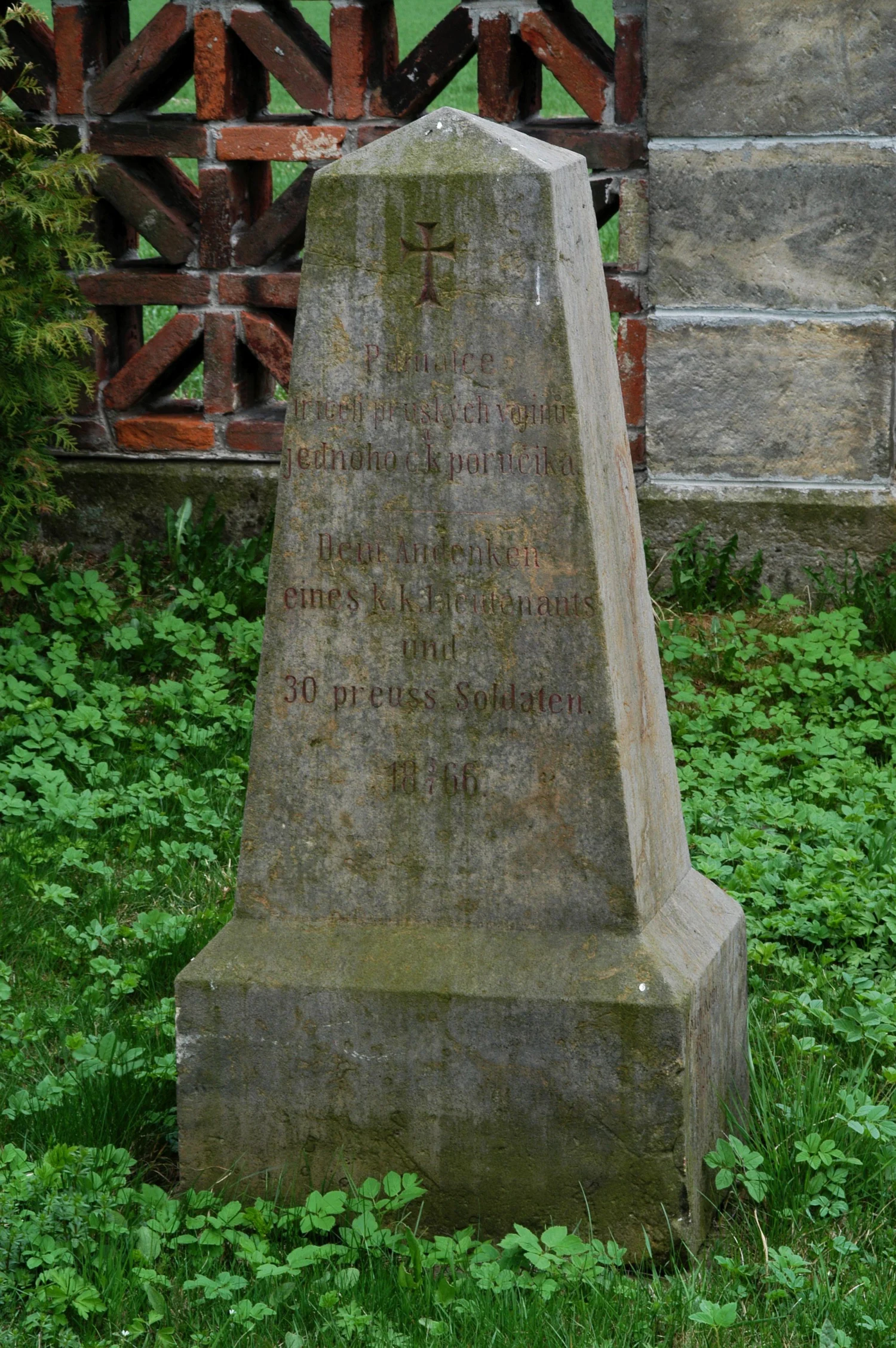 Čelní strana: \ Památce třiceti pruských vojínů a jednoho c.k. poručíka. \ Dem Andenken eines k. k. Lieutenants und 30 preuss. Soldaten. 18 3/7 66. \ Pravá strana: \ Renov. Kom. 1890 Č. 212. \