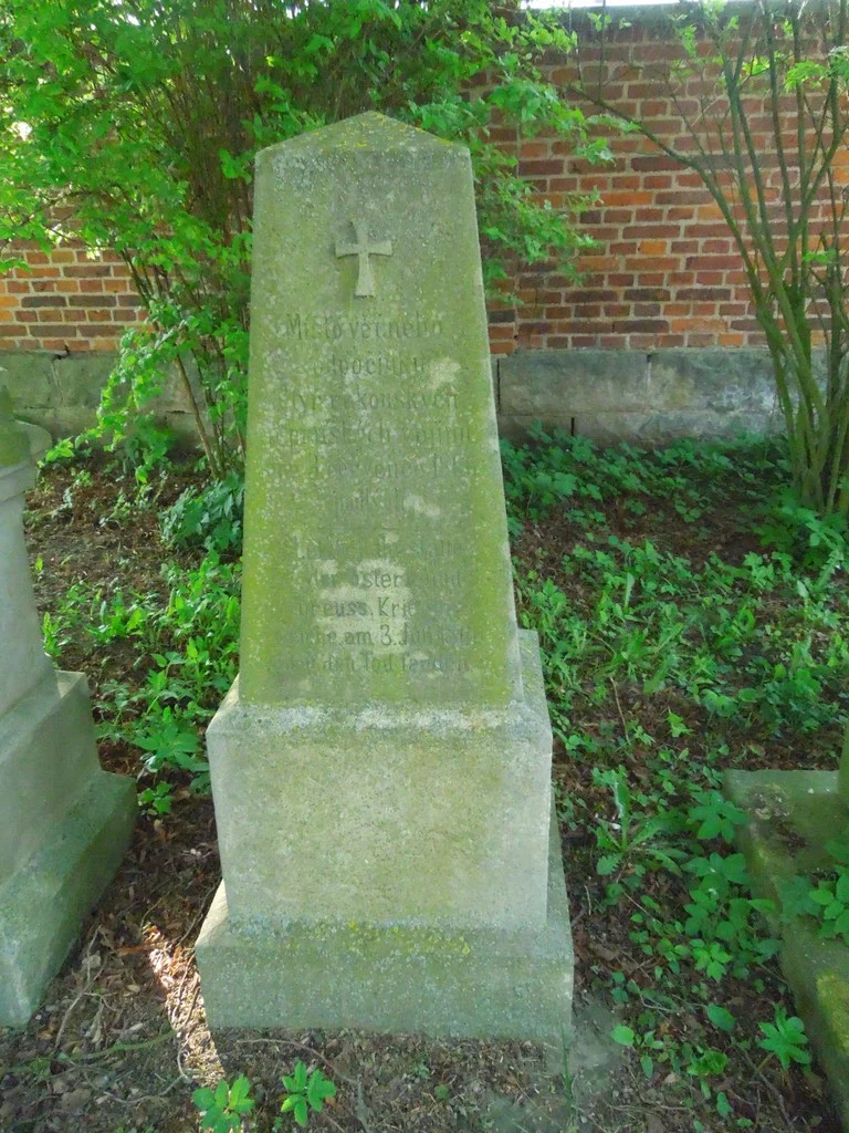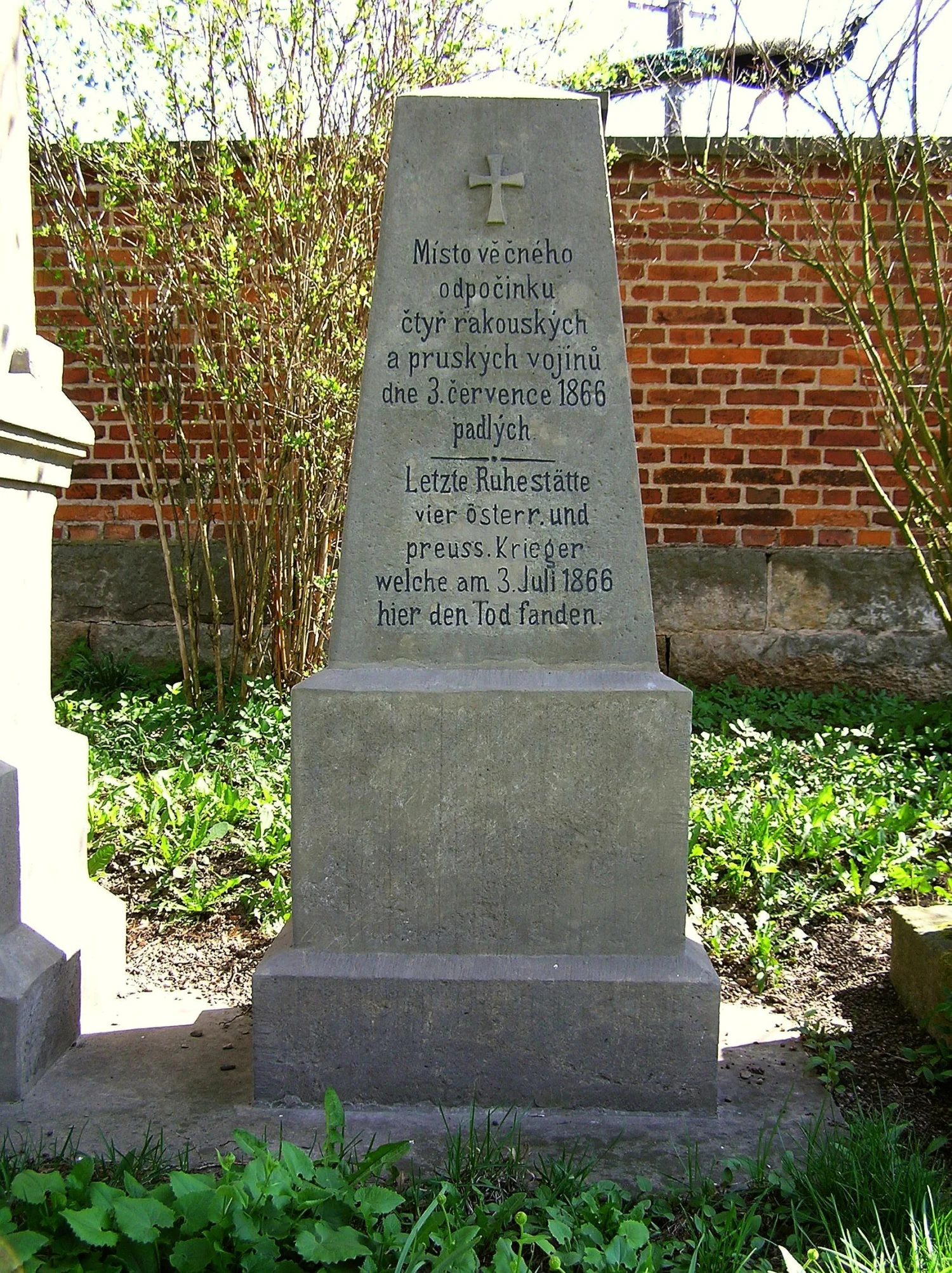 | Text na památce: | Čelní strana: \ Místo věčného odpočinku čtyř rakouských a pruských vojínů dne 3. července 1866 padlých. \ Letzte Ruhestätte vier österr. und preuss. krieger welche am 3. Juli 1866 hier den Tod fanden.\ Pravá strana: \ Č. 213. \ |