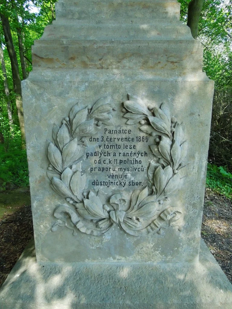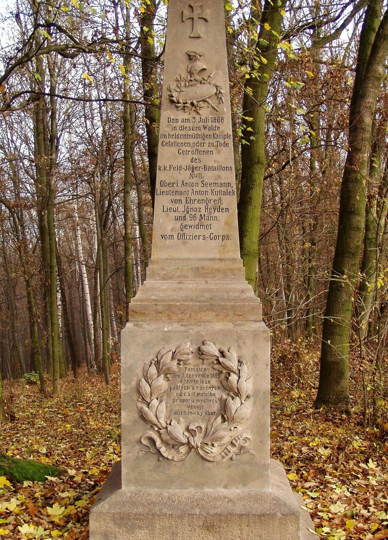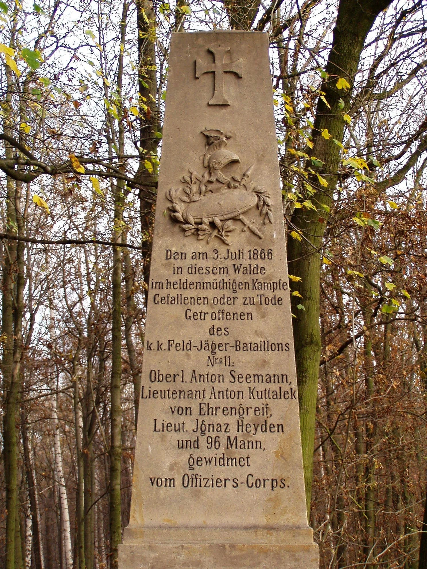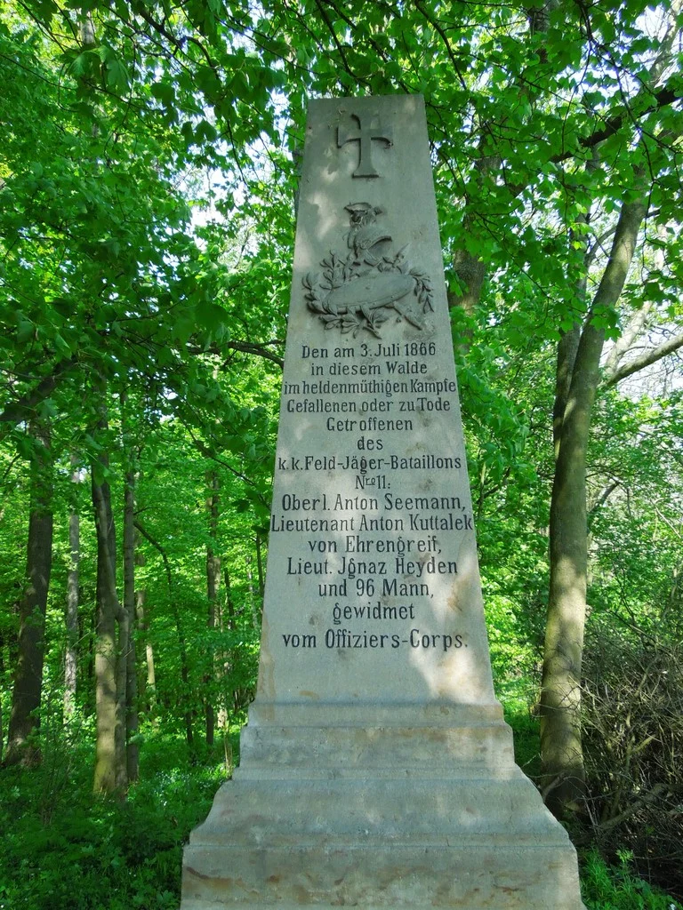 3. července v tomto lese ve statečném boji padlým nebo smrtelně zasaženým z c. k. polního mysliveckého praporu č. 11: nadpor. Anton Seemann, por. Anton Kuttalek z Ehrengreifu, por. Ignaz Heyden a 96 mužů, věnováno důstojnickým sborem.