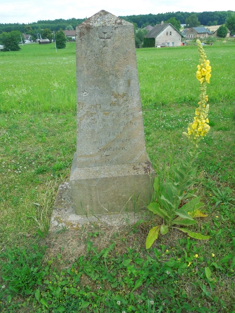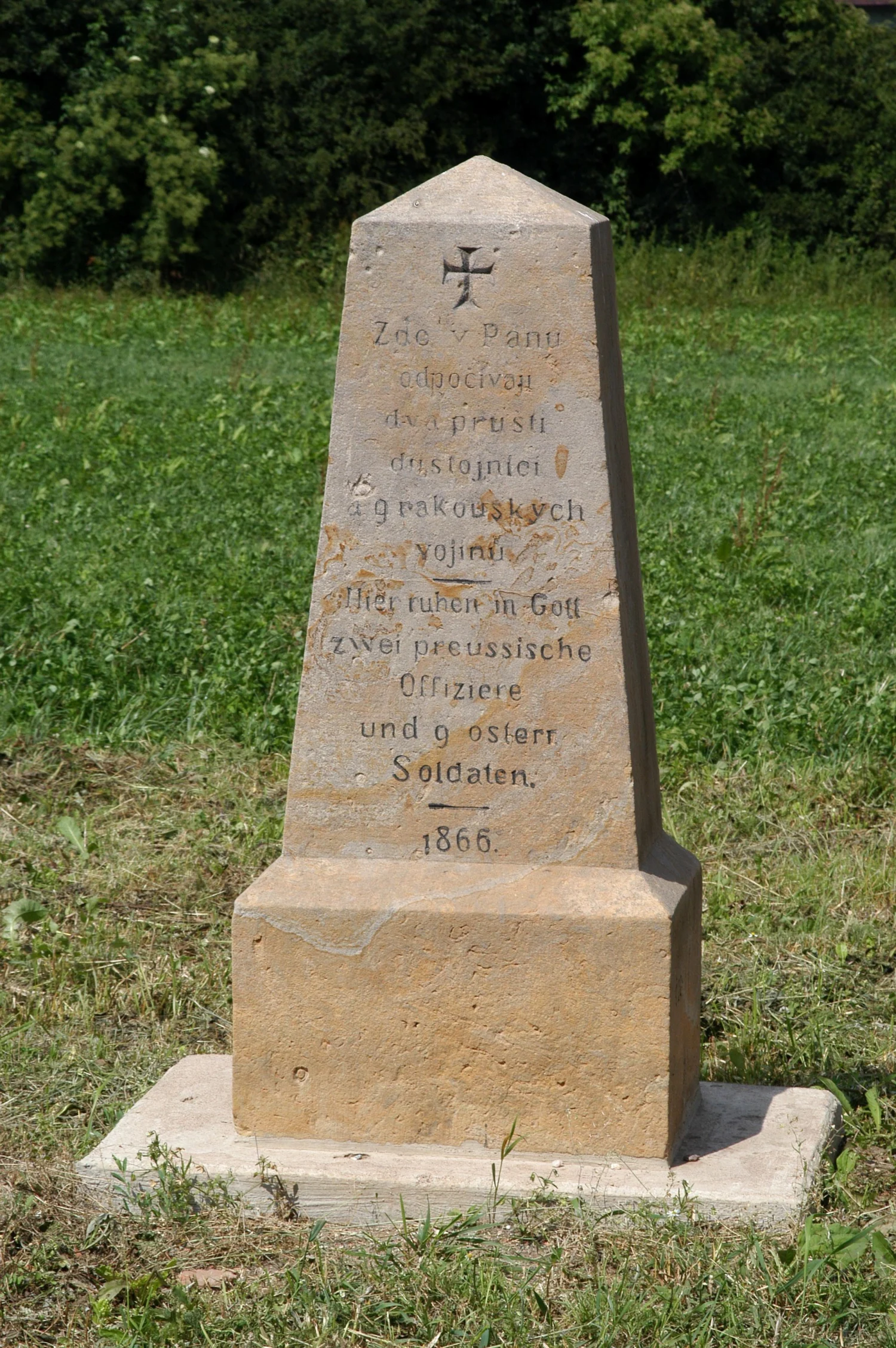 Čelní strana: \ Zde v Pánu odpočívají dva pruští důstojníci a 9 rakouských vojínů. \ Hier ruhen in Gott zwei preussische Offiziere und 9 österr. Soldaten. \ 1866. \ Pravá strana: \ Renov. Kom. 1890. Č. 224. \