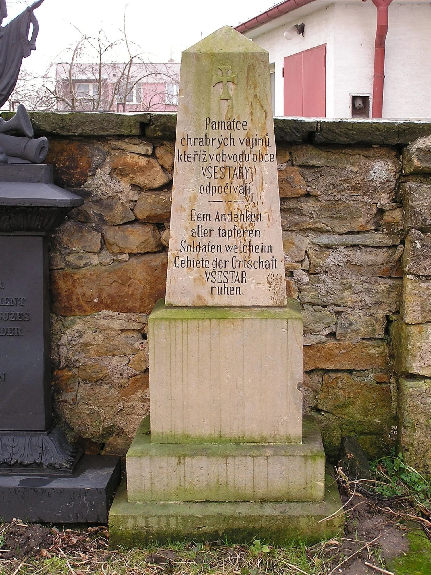 Čelní strana: \ Památce chrabrých vojínů, kteříž v obvodu obce VŠESTARY odpočívají. \ Dem Andenken aller tapferen Soldaten welcheim Gebiete der Ortschaft VŠESTAR ruhen. \ Pravá strana soklu: \ Kom. 1890. Č. 238. \