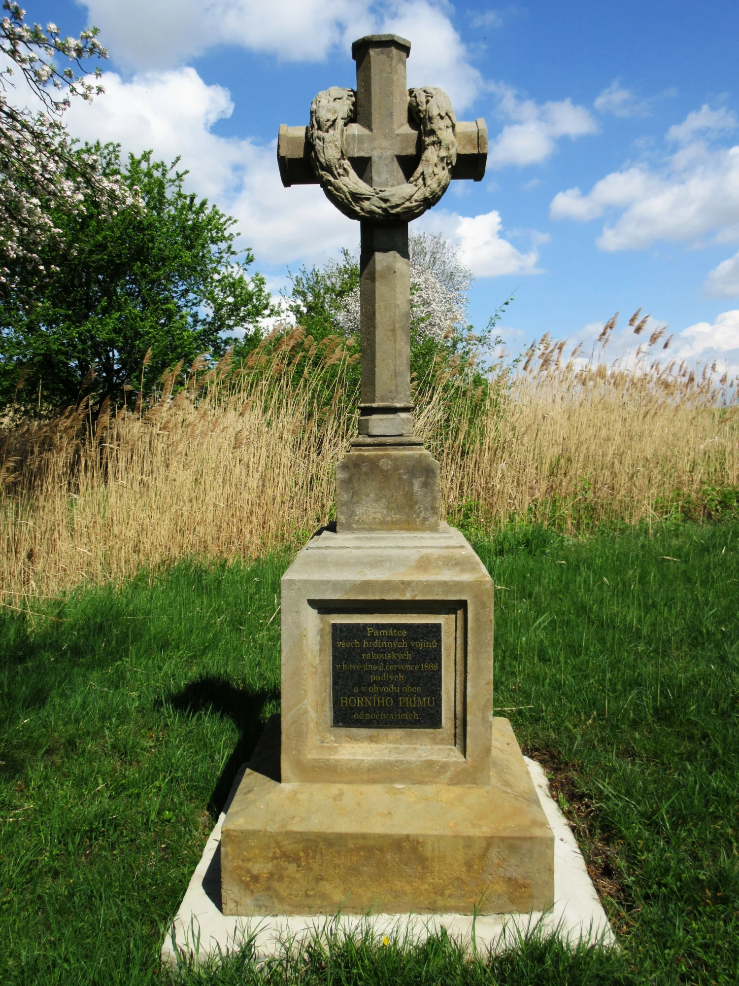 | Text na památce: | Čelní strana: \ Památce všech hrdinných vojínů rakouských v bitvě dne 3. července 1866 padlých a v obvodu obce HORNÍHO PŘÍMU odpočívajících. \ Pravá strana: \ Č. 246. \ Zadní strana: \ Zum Andenken aller tapferen k.k. österr. Krieger, in der Schlacht den 3. Juli 1866 gefallen und in der Umgebung von OBER PRIM ruhend. \ |