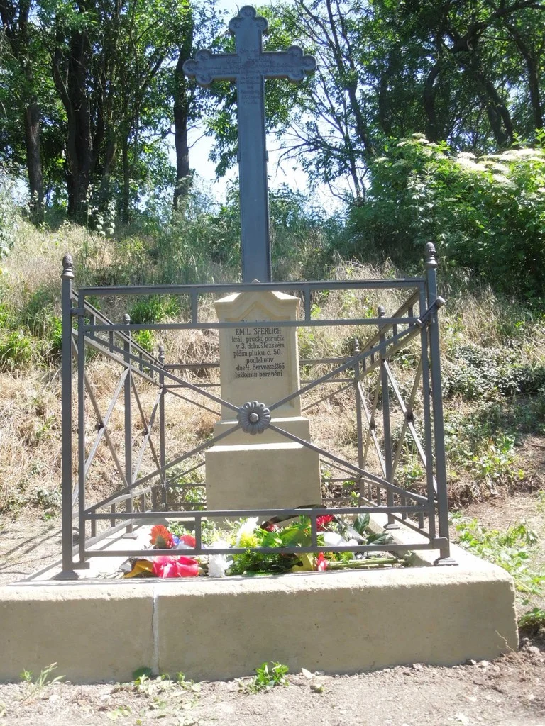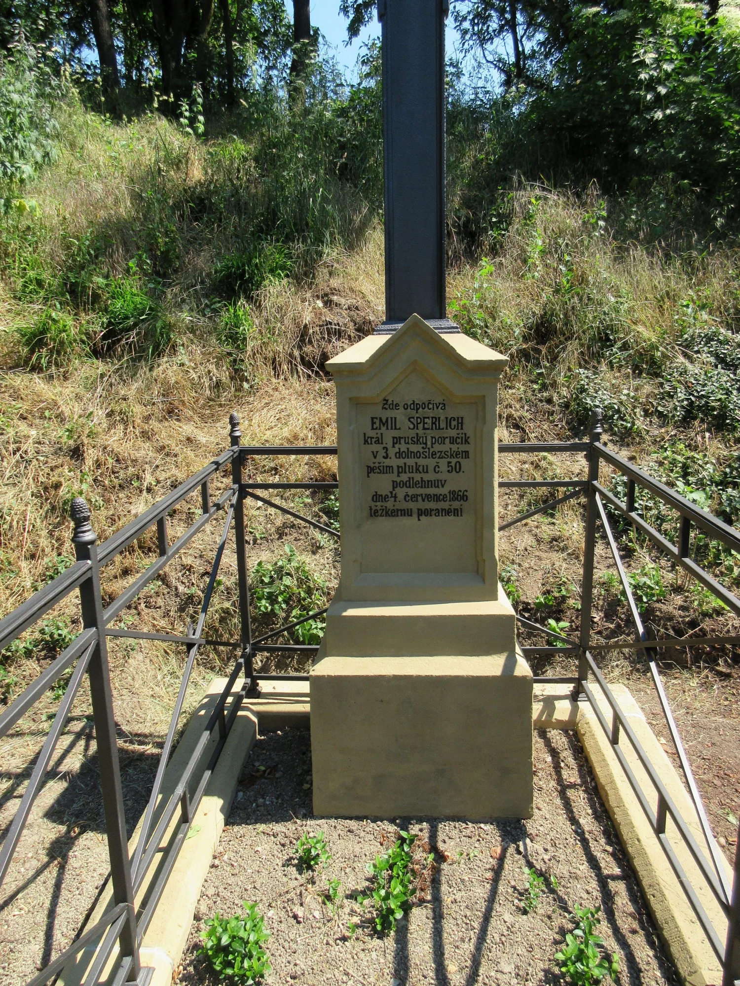 | Text na památce: | Ramena kříže: \ Hier ruht Emil Sperlich, Sec. Lieutenant im Königl. PreuSz. 3t NiederSchl. Inf. Regt. No. 50. geb. d. 23. Jan. 1843 in Breslau, geSt. d. 4. Juli 1866 an Seiner, in der Schlacht von Königgrätz erhaltenen Wunde. \ Čelní strana: \ Zde odpočívá EMIL SPERLICH král. pruský poručík v 3. dolnoslezském pěším pluku č. 50. podlehnuv dne 4. července 1866 těžkému poranění. \ Pravá strana: \ Č. 248. \ |