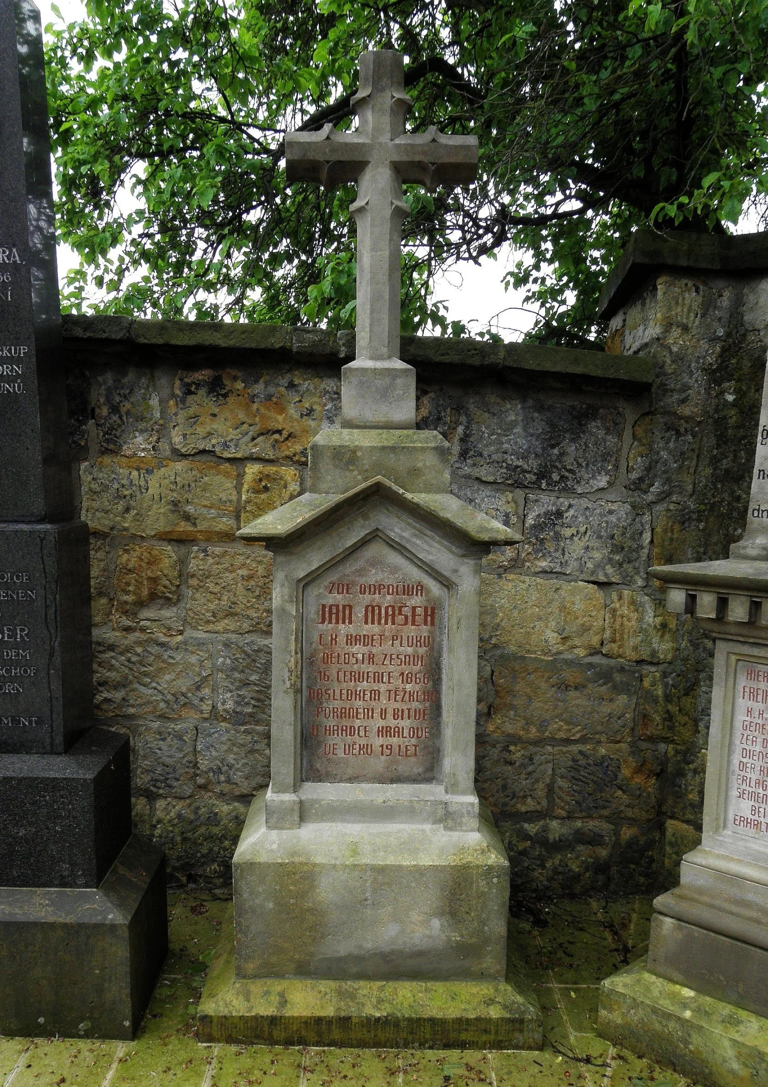 | Text na památce: | Čelní strana: \ ZDE ODPOČÍVÁ JAN MAŠEK C.K. KADET PLUKU DĚLOSTŘ. ZESNUL 16. ČERVENCE 1866 NÁSLEDKEM TĚŽKÉHO PORANĚNÍ V BITVĚ U HRADCE KRÁLOVÉ VE VĚKU 19 LET. \ Pravá strana: \ Renov.Kom.1890. Č. 255. \ |
