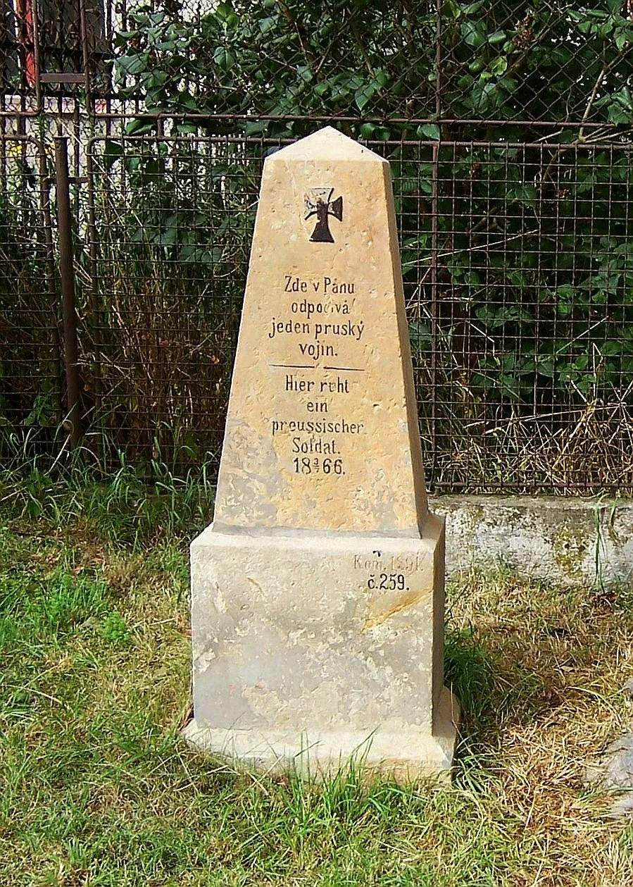 | Text na památce: | Čelní strana: \ Zde v Pánu odpočívá jeden pruský vojín. \ Hier ruht ein preussischer Soldat. \ 18 3/7 66. \ Čelní strana: \ Kom. 1891. č. 259. \ |