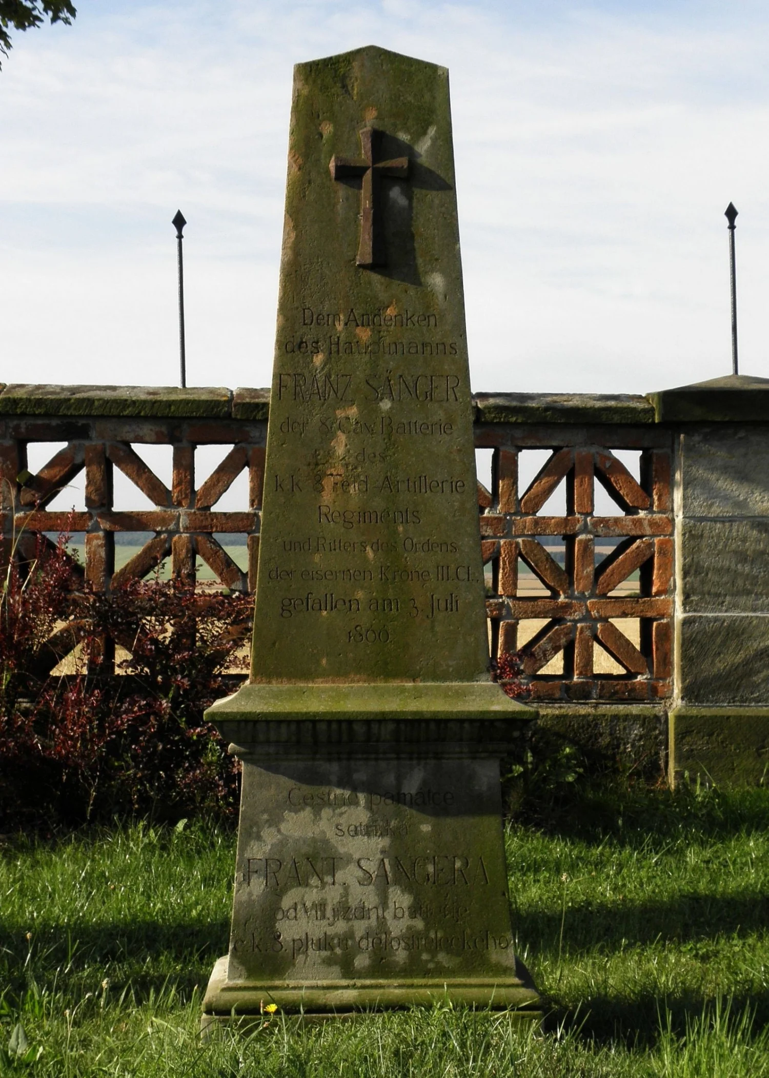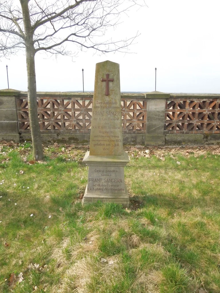 Čelní strana: \ Dem Andenken des Hauptmanns FRANZ SÄNGER der 8. Cav. Batterie des k. k. 8. Feld – Artillerie Regiments und Ritters des Ordens der eisernen Krone III. Cl. gefallen am 3. Juli 1866. \ Čestné památce setníka FRANT. SÄNGERA od VIII. jízdní batterie c. k. 8. pluku dělostřeleckého. \ Pravá strana: \ Kom. 1891. Č. 267. \