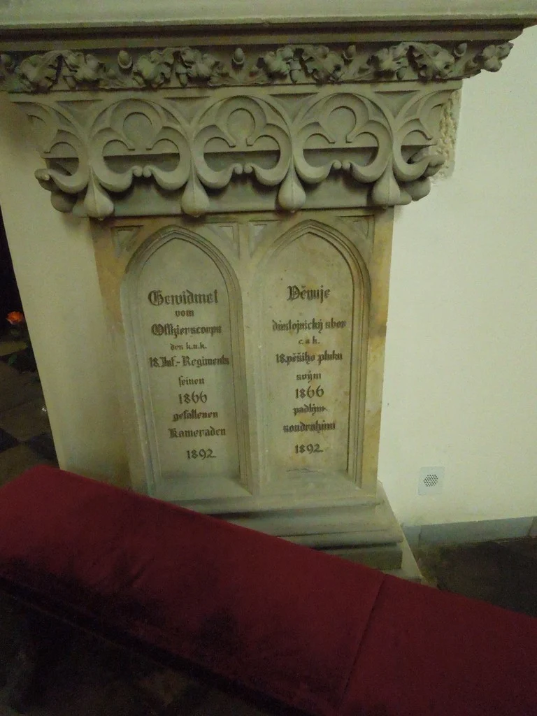 | Text na památce: | Čelní nápisní deska – levý sloupec: \ Im Jahre \ Pravý sloupec: \ Roku \ Uprostřed: \ 1866 \ fielen in Ehren (levý sloupec) čestně padli (pravý sloupec) der k. k. Major (levý sloupec) c. k. major (pravý sloupec) Rudolf Schmidt Edl. v. SchwarzenSchild, (vše uprostřed) die k. k. Hauptleute (levý sloupec) c. k. setníci (pravý sloupec) Ant. Zerha, Fil. Kowaržik, Jos. Pohl, (vše uprostřed) die k. k. Oberlieutenants (levý sloupec) c. k. nadporučíci (pravý sloupec) Ant. Rubinger, Edm. Hlubek, K. Bundsmann, Ad. Köhler-Aisleitner, Fr. Schmidt von Chrenberg, Herm. Groller von Mildensee, (vše uprostřed) die k. k. Lieutenants (levý sloupec) c. k. poručíci (pravý sloupec) Friedr. WünScher, Laur. Lhota, Lothar ReiSing von ReiSinger, Fr. Lang, Georg KutSchera, Fr. Gall, Jos. Malek, Hugo RamiSch, Ad. Ochs, Ant. WieSe, Aug. ByStromovský, Melchior Glockner, Georg Dobroslaw (vše uprostřed) in Ganzen (levý sloupek) celkem (pravý sloupec) 23 Offiziere, (levý sloupec) 23 důstojníci, (pravý sloupec) 53 Chargen (levý sloupec) 53 šarže (pravý sloupec) und 186 Mann. (levý sloupec) a 186 mužů. (pravý sloupec) \ Levá nápisní deska: \ Gewidmet vom Offizierscorps des k.u.k. 18. Inf.-Regiments seinen 1866 gefallenen Kameraden 1892. \ Pravá nápisní deska: \ Věnuje důstojnický sbor c. a k. 18. pěšího pluku svým 1866 padlým soudruhům 1892. \ |