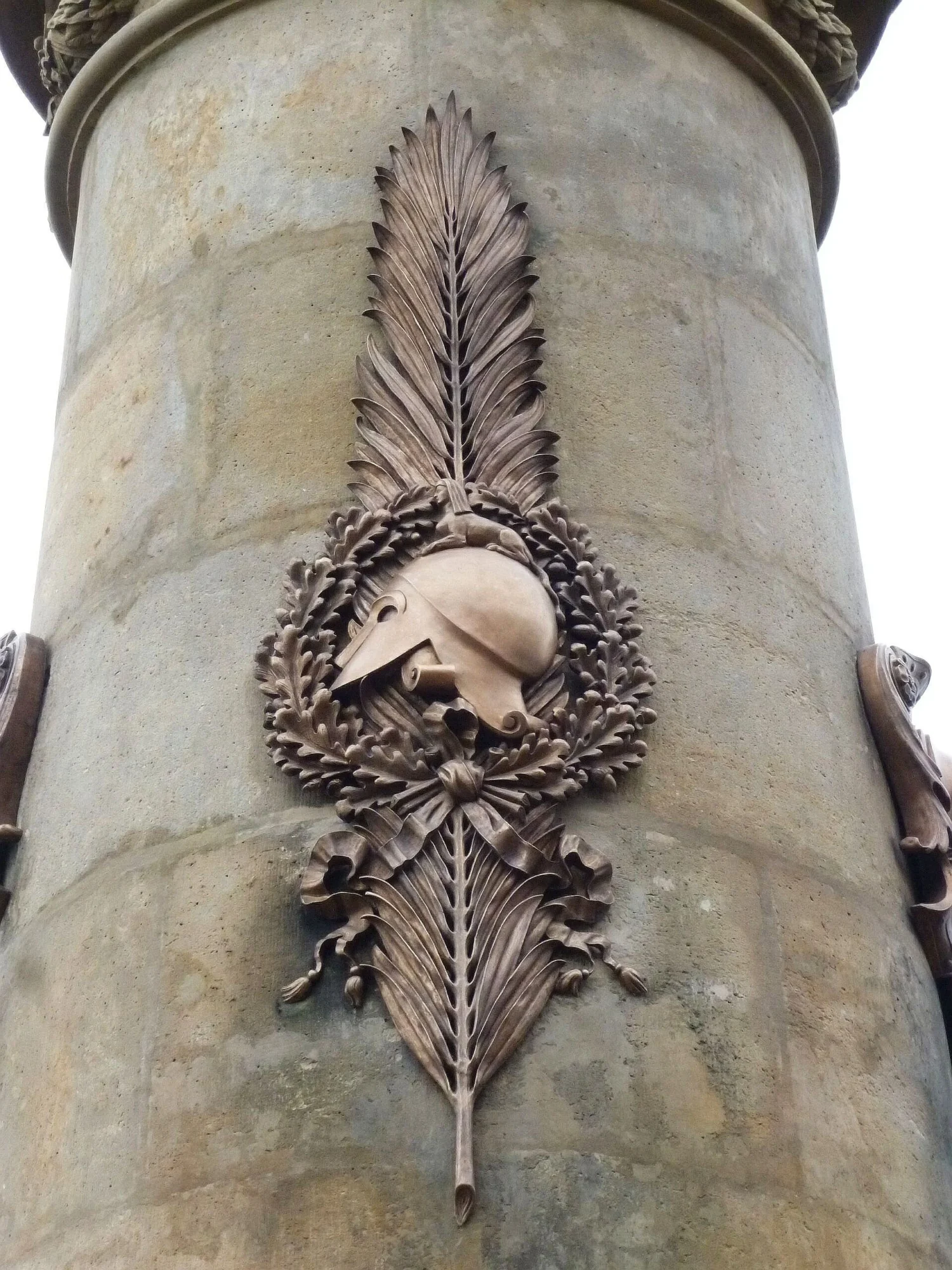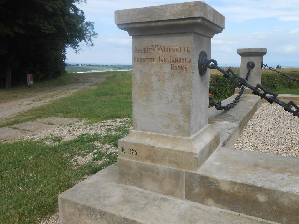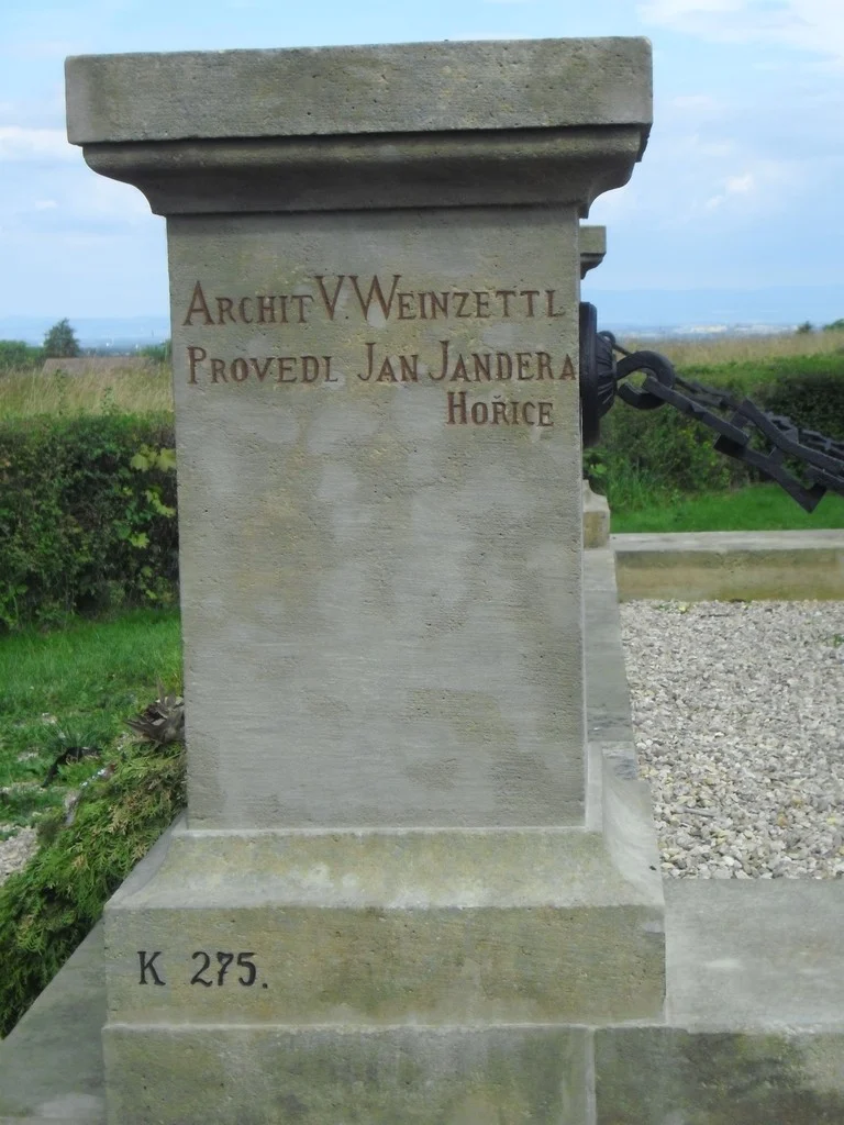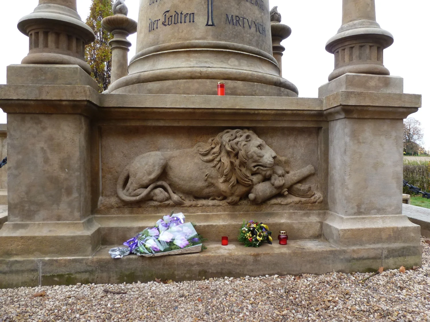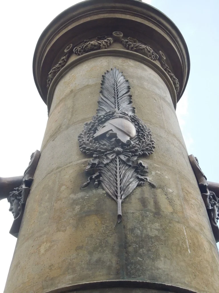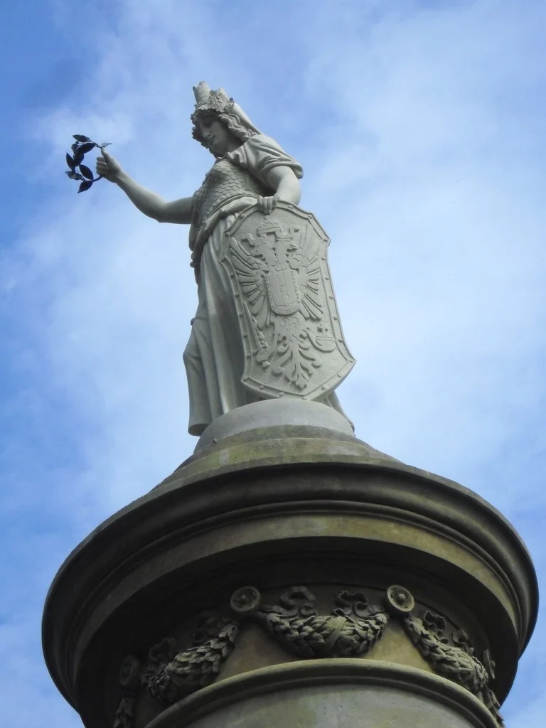 Monumentální pískovcový sloup s plastikou Austrie na vrcholu, zdoben bronzovými reliéfy a reliéfem spícího lva. Viz poznámka.