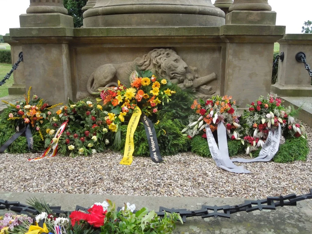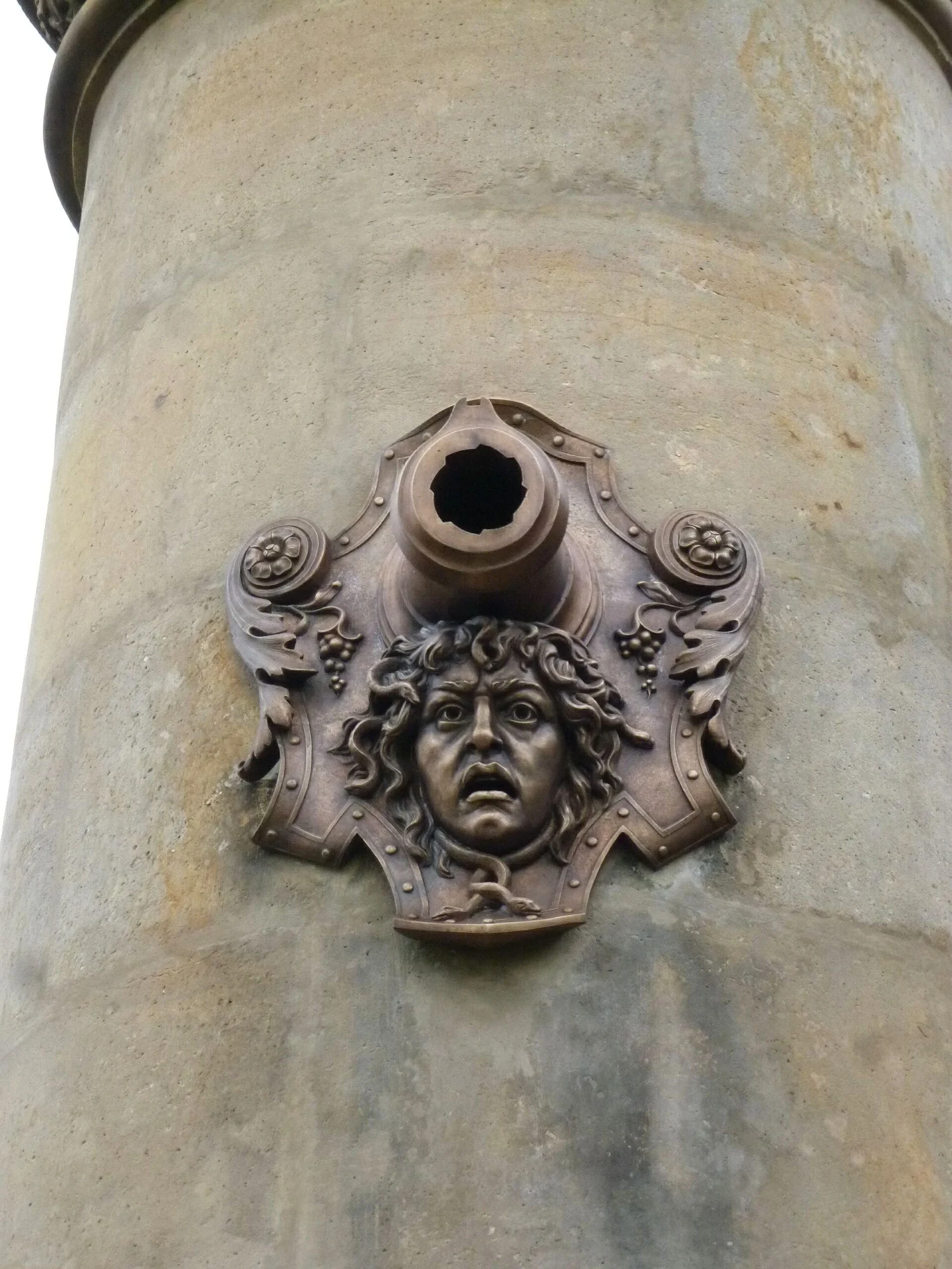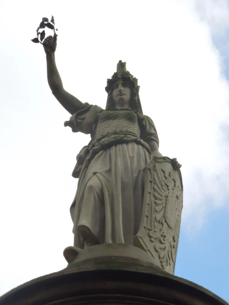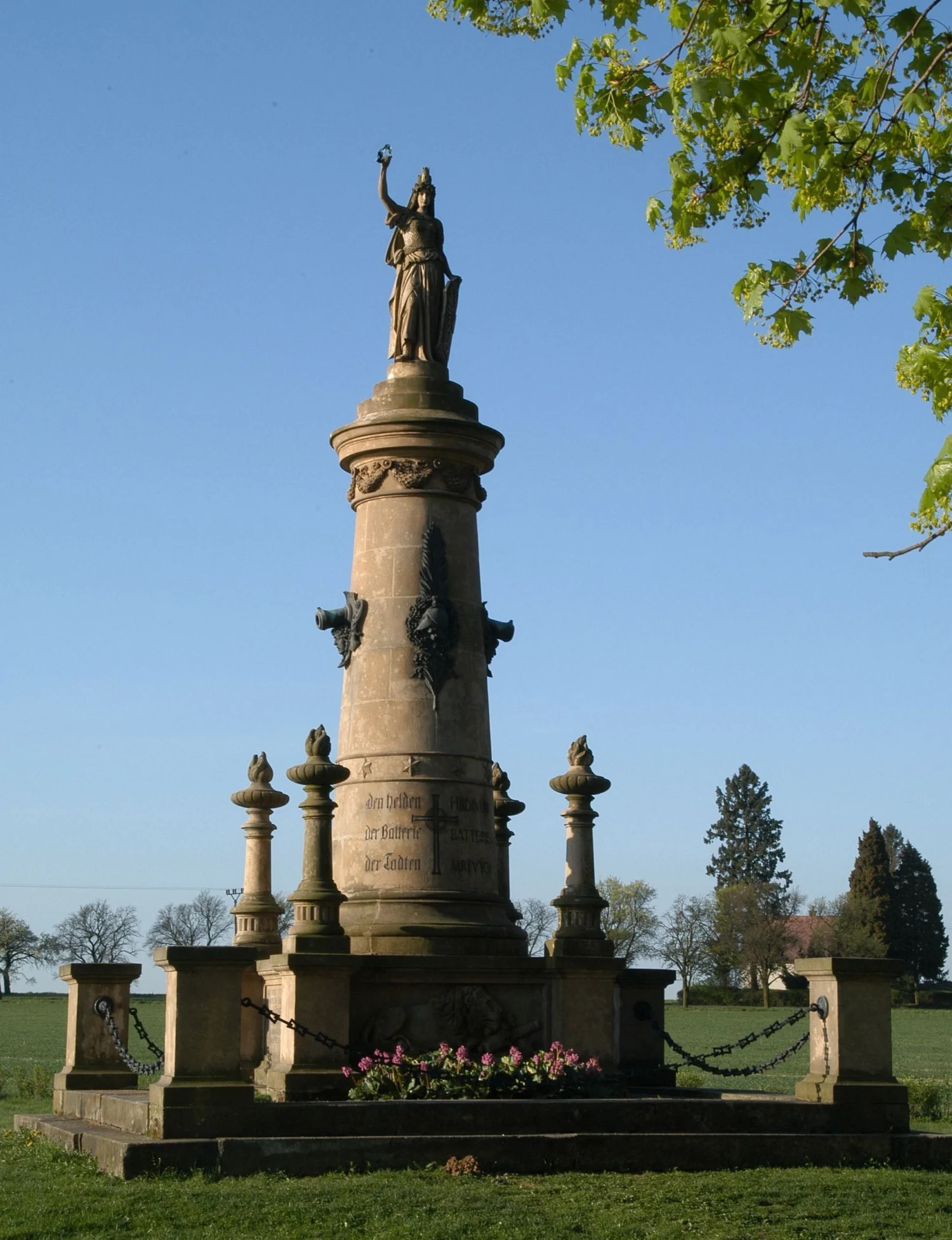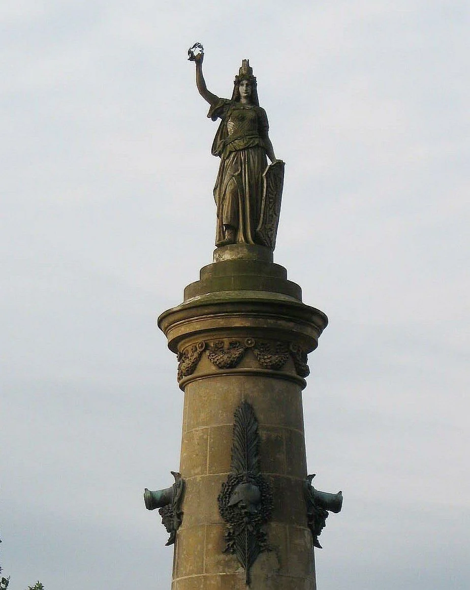 Monumentální pískovcový sloup s plastikou Austrie na vrcholu, zdoben bronzovými reliéfy a reliéfem spícího lva. Viz poznámka.