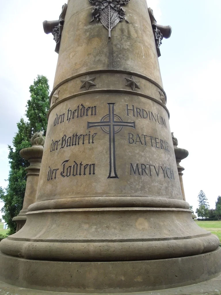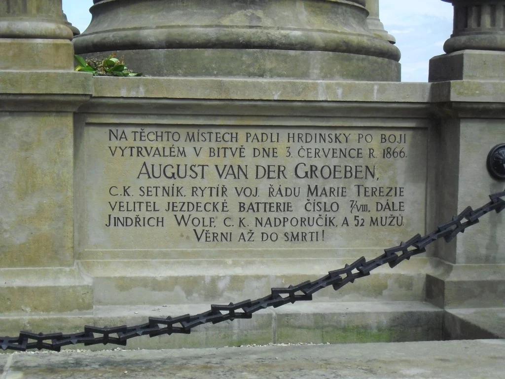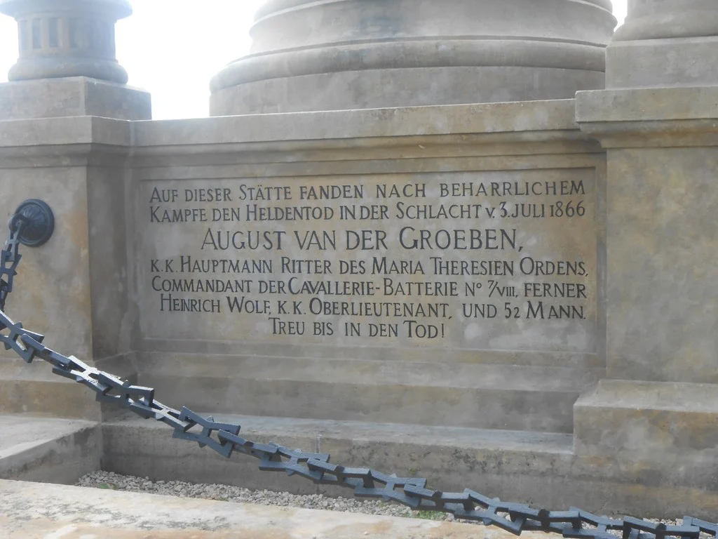 Čelní strana sloupu – dva sloupce – levý sloupec: \ Den Helden der Batterie der Todten \ pravý sloupec: HRDINŮM BATTERIE MRTVÝCH \ Levá strana hranolu: \ AUF DIESER STÄTTE FANDEN NACH BEHARRLICHEM KAMPFE DEN HELDENTOD IN DER SCHLACHT V. 3. JULI 1866. AUGUST VAN DER GROEBEN, K.K. HAUPTMANN, RITTER DES MARIA THERESIEN-ORDENS, COMMANDANT DER CAVALLERIE-BATTERIE NO 7/VIII, FERNER F. HEINRICH WOLF, K.K. OBERLIEUTENANT, UND 52 MANN. TREU BIS IN DEN TOD! \ Zadní strana hranolu: \ ZŘÍZENO KOMITÉTEM PRO UDRŽOVÁNÍ VOJENSKÝCH POMNÍKŮ NA BOJIŠTI KRÁLOVÉ HRADECKÉM PŘISPĚNÍM VOJENSKÉHO ŘÁDU MARIE TEREZIE A C. A K. RAKOUS= KÉHO DĚLOSTŘELECTVA L. P. MDCCCXCIII. \ ERRICHTET VOM COMITÉ ZUR ERHALTUNG DER KRIEGER= DENKMALE AUF DEM KÖNIGGRÄTZER SCHLACHTFELDE MIT BEIHILFE DES MILIT. MARIA THERESIEN-ORDENS UND DER K. UND K. ÖSTERR. ARTILLERIE-WAFFE I. J. MDCCCXCIII. \ Pravá strana hranolu: \ NA TĚCHTO MÍSTECH PADLI HRDINSKY PO BOJI VYTRVALÉM V  BITVĚ DNE 3. ČERVENCE R. 1866. AUGUST VAN DER GROEBEN, C. K. SETNÍK, RYTÍŘ VOJ. ŘÁDU MARIE TEREZIE VELITEL JEZDECKÉ BATTERIE ČÍSLO 7/VIII, DÁLE JINDŘICH WOLF, C. K. NADPORUČÍK, A 52 MUŽŮ. VĚRNI AŽ DO SMRTI ! \ Pravá strana pravého čelního sloupku oplocení: \ ARCHIT. V. WEINZETTL PROVEDL JAN JANDERA HOŘICE \ Pravá strana soklu pravého čelního sloupku oplocení: \ K. 275. \