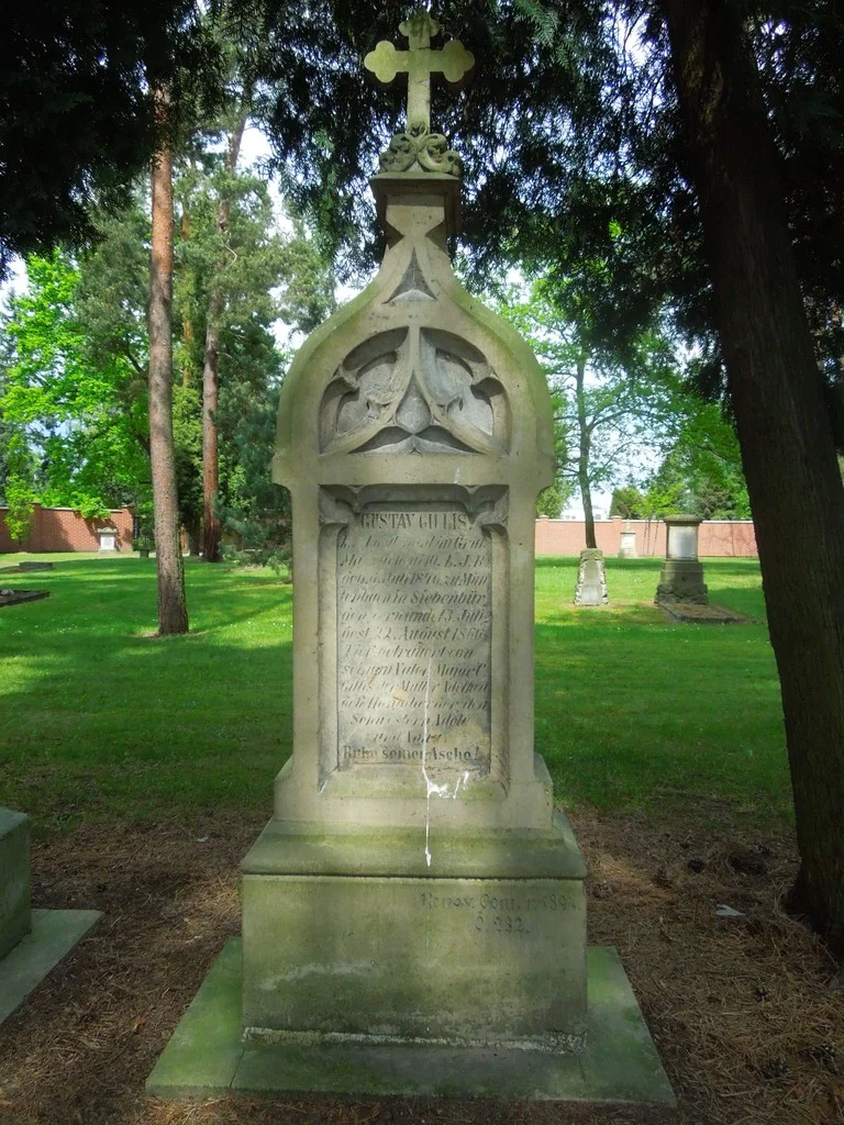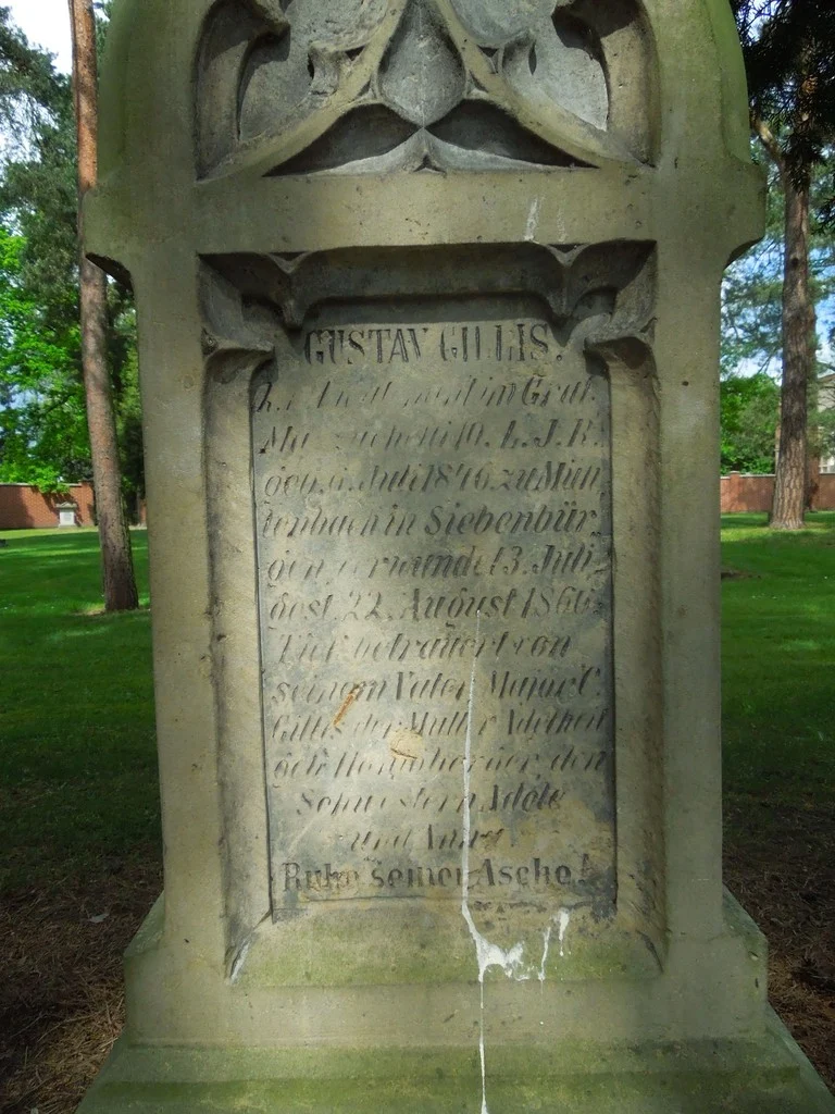 Gustav Gillis, c. k. podporučík v 10. pěším pluku hraběte Mazzuchelliho, narozen 6. července 1846 v Mühlenbachu v Sedmihradsku, zraněn 3. července, zemřel 22. srpna 1866. Hluboce želen svým otcem majorem C. Gillisem, matkou Adelheit, rozenou Honigberger, sestrami Adéle a Anne. Pokoj jeho popelu.